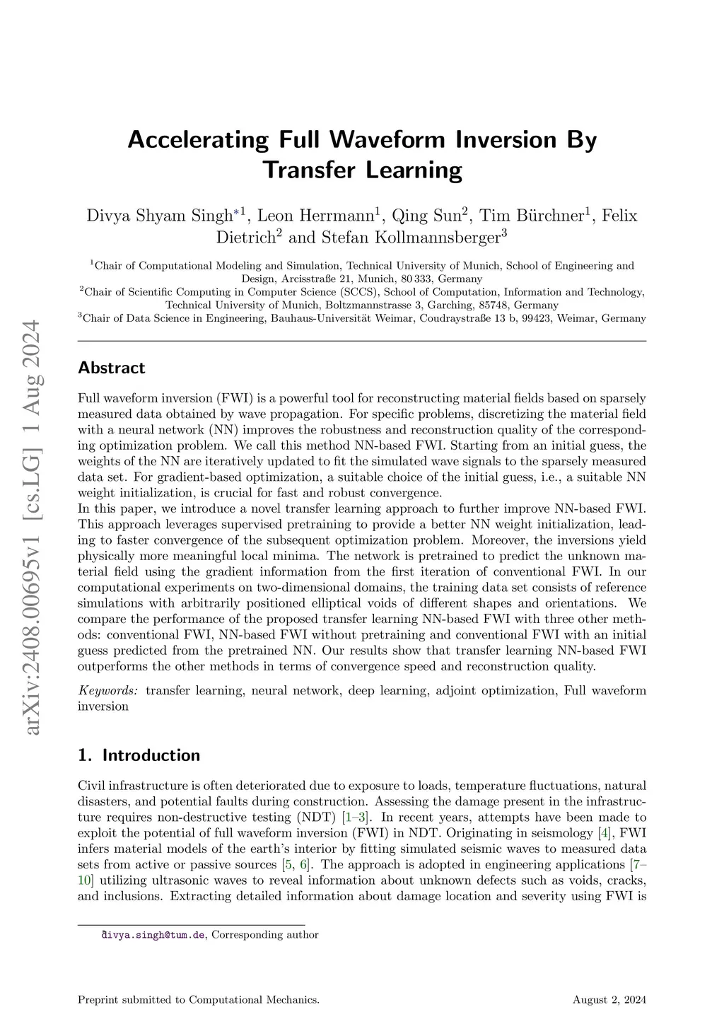 Full waveform inversion (FWI) is a powerful tool for reconstructing material fields based on sparsely measured data obtained by wave propagation. For specific problems, discretizing the material field with a neural network (NN) improves the robustness and reconstruction quality of the corresponding optimization problem. We call this method NN-based FWI. Starting from an initial guess, the weights of the NN are iteratively updated to fit the simulated wave signals to the sparsely measured data set. For gradient-based optimization, a suitable choice of the initial guess, i.e., a suitable NN weight initialization, is crucial for fast and robust convergence. In this paper, we introduce a novel transfer learning approach to further improve NN-based FWI. This approach leverages supervised pretraining to provide a better NN weight initialization, leading to faster convergence of the subsequent optimization problem. Moreover, the inversions yield physically more meaningful local minima. The network is pretrained to predict the unknown material field using the gradient information from the first iteration of conventional FWI. In our computational experiments on two-dimensional domains, the training data set consists of reference simulations with arbitrarily positioned elliptical voids of different shapes and orientations. We compare the performance of the proposed transfer learning NN-based FWI with three other methods: conventional FWI, NN-based FWI without pretraining and conventional FWI with an initial guess predicted from the pretrained NN. Our results show that transfer learning NN-based FWI outperforms the other methods in terms of convergence speed and reconstruction quality.