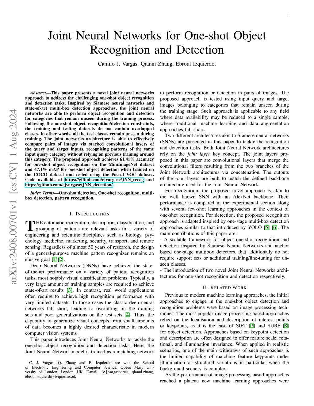 Joint Neural Networks for One-shot Object Recognition and Detection