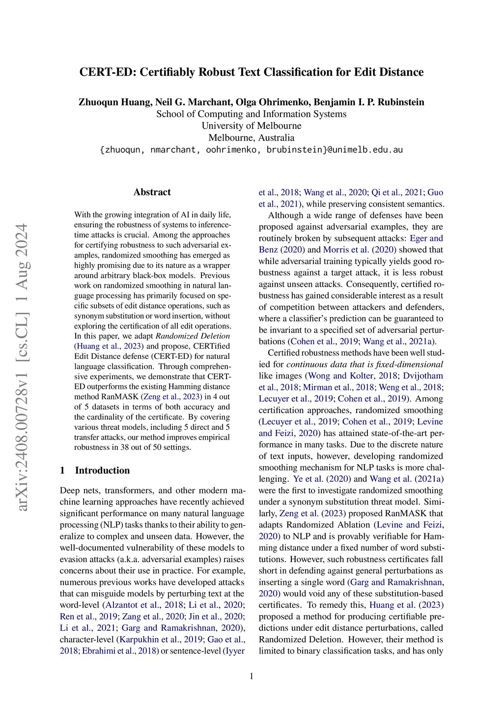With the growing integration of AI in daily life, ensuring the robustness of systems to inference-time attacks is crucial. Among the approaches for certifying robustness to such adversarial examples, randomized smoothing has emerged as highly promising due to its nature as a wrapper around arbitrary black-box models. Previous work on randomized smoothing in natural language processing has primarily focused on specific subsets of edit distance operations, such as synonym substitution or word insertion, without exploring the certification of all edit operations. In this paper, we adapt Randomized Deletion (Huang et al., 2023) and propose, CERTified Edit Distance defense (CERT-ED) for natural language classification. Through comprehensive experiments, we demonstrate that CERT-ED outperforms the existing Hamming distance method RanMASK (Zeng et al., 2023) in 4 out of 5 datasets in terms of both accuracy and the cardinality of the certificate. By covering various threat models, including 5 direct and 5 transfer attacks, our method improves empirical robustness in 38 out of 50 settings.