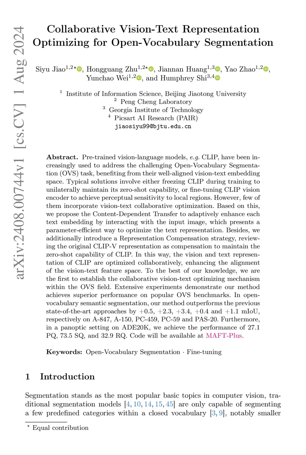 Pre-trained vision-language models, e.g. CLIP, have been increasingly used to address the challenging Open-Vocabulary Segmentation (OVS) task, benefiting from their well-aligned vision-text embedding space. Typical solutions involve either freezing CLIP during training to unilaterally maintain its zero-shot capability, or fine-tuning CLIP vision encoder to achieve perceptual sensitivity to local regions. However, few of them incorporate vision-text collaborative optimization. Based on this, we propose the Content-Dependent Transfer to adaptively enhance each text embedding by interacting with the input image, which presents a parameter-efficient way to optimize the text representation. Besides, we additionally introduce a Representation Compensation strategy, reviewing the original CLIP-V representation as compensation to maintain the zero-shot capability of CLIP. In this way, the vision and text representation of CLIP are optimized collaboratively, enhancing the alignment of the vision-text feature space. To the best of our knowledge, we are the first to establish the collaborative vision-text optimizing mechanism within the OVS field. Extensive experiments demonstrate our method achieves superior performance on popular OVS benchmarks. In open-vocabulary semantic segmentation, our method outperforms the previous state-of-the-art approaches by +0.5, +2.3, +3.4, +0.4 and +1.1 mIoU, respectively on A-847, A-150, PC-459, PC-59 and PAS-20. Furthermore, in a panoptic setting on ADE20K, we achieve the performance of 27.1 PQ, 73.5 SQ, and 32.9 RQ. Code will be available at https://github.com/jiaosiyu1999/MAFT-Plus.git .