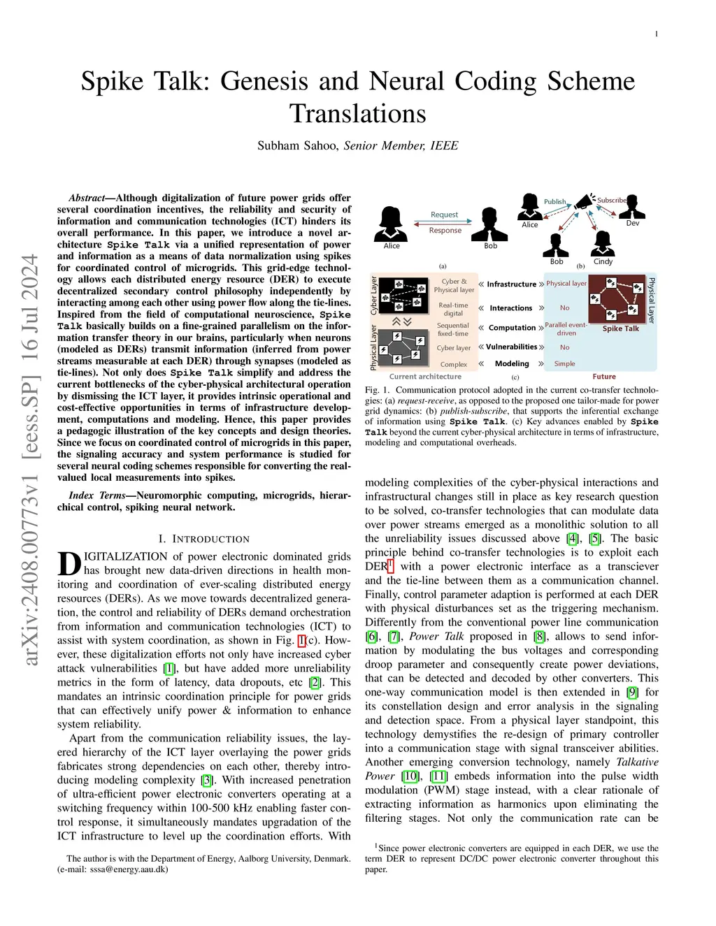 Although digitalization of future power grids offer several coordination incentives, the reliability and security of information and communication technologies (ICT) hinders its overall performance. In this paper, we introduce a novel architecture Spike Talk via a unified representation of power and information as a means of data normalization using spikes for coordinated control of microgrids. This grid-edge technology allows each distributed energy resource (DER) to execute decentralized secondary control philosophy independently by interacting among each other using power flow along the tie-lines. Inspired from the field of computational neuroscience, Spike Talk basically builds on a fine-grained parallelism on the information transfer theory in our brains, particularly when neurons (modeled as DERs) transmit information (inferred from power streams measurable at each DER) through synapses (modeled as tie-lines). Not only does Spike Talk simplify and address the current bottlenecks of the cyber-physical architectural operation by dismissing the ICT layer, it provides intrinsic operational and cost-effective opportunities in terms of infrastructure development, computations and modeling. Hence, this paper provides a pedagogic illustration of the key concepts and design theories. Since we focus on coordinated control of microgrids in this paper, the signaling accuracy and system performance is studied for several neural coding schemes responsible for converting the real-valued local measurements into spikes.