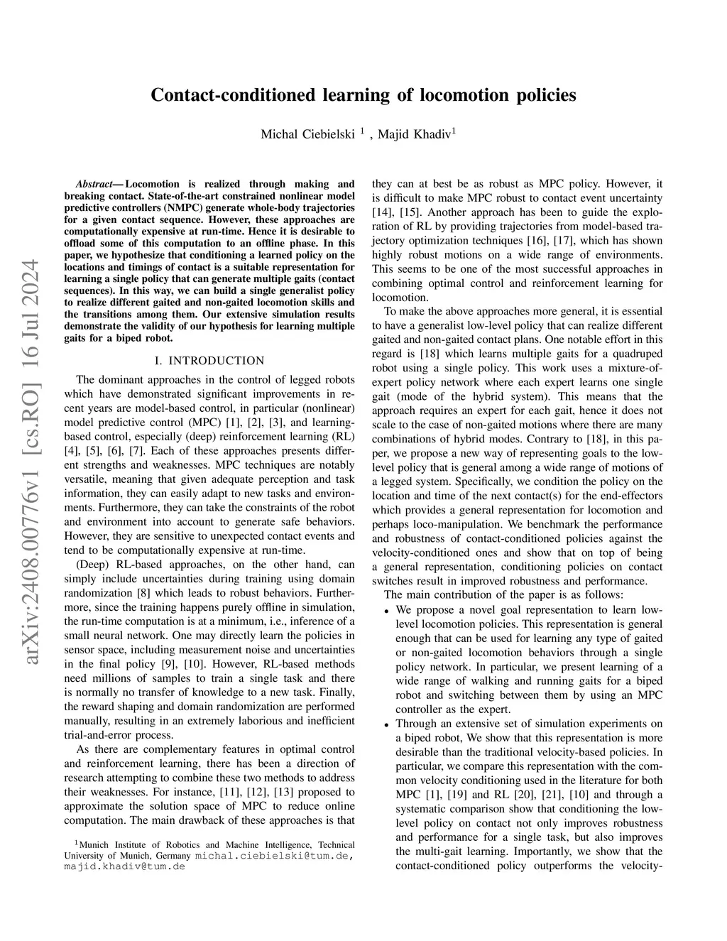 Contact-conditioned learning of multi-gait locomotion policies