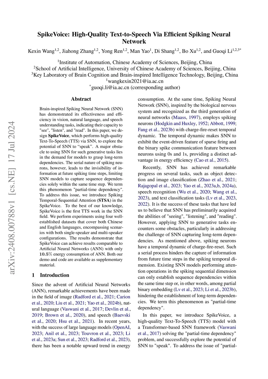 Brain-inspired Spiking Neural Network (SNN) has demonstrated its effectiveness and efficiency in vision, natural language, and speech understanding tasks, indicating their capacity to "see", "listen", and "read". In this paper, we design \textbf{SpikeVoice}, which performs high-quality Text-To-Speech (TTS) via SNN, to explore the potential of SNN to "speak". A major obstacle to using SNN for such generative tasks lies in the demand for models to grasp long-term dependencies. The serial nature of spiking neurons, however, leads to the invisibility of information at future spiking time steps, limiting SNN models to capture sequence dependencies solely within the same time step. We term this phenomenon "partial-time dependency". To address this issue, we introduce Spiking Temporal-Sequential Attention STSA in the SpikeVoice. To the best of our knowledge, SpikeVoice is the first TTS work in the SNN field. We perform experiments using four well-established datasets that cover both Chinese and English languages, encompassing scenarios with both single-speaker and multi-speaker configurations. The results demonstrate that SpikeVoice can achieve results comparable to Artificial Neural Networks (ANN) with only 10.5 energy consumption of ANN.