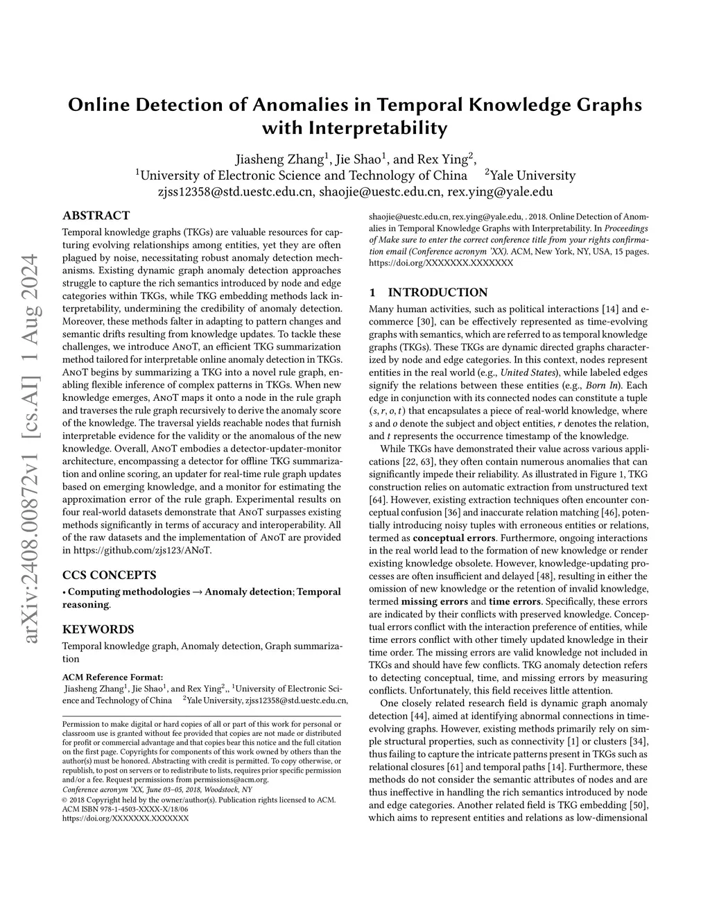 Online Detection of Anomalies in Temporal Knowledge Graphs with