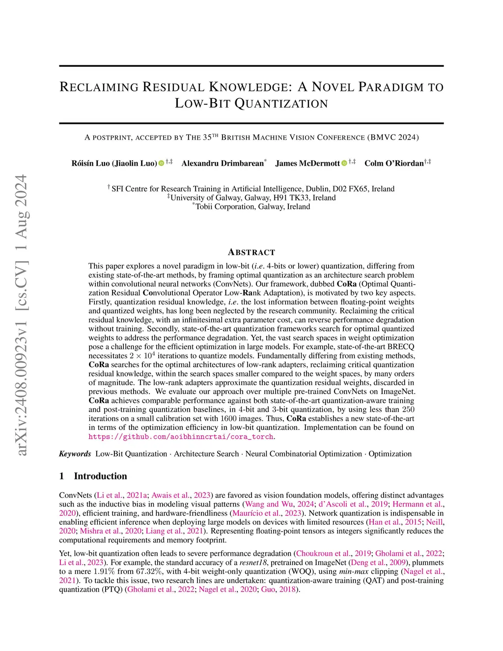 This paper explores a novel paradigm in low-bit (i.e. 4-bits or lower) quantization, differing from existing state-of-the-art methods, by framing optimal quantization as an architecture search problem within convolutional neural networks (ConvNets). Our framework, dubbed \textbf{CoRa} (Optimal Quantization Residual \textbf{Co}nvolutional Operator Low-\textbf{Ra}nk Adaptation), is motivated by two key aspects. Firstly, quantization residual knowledge, i.e. the lost information between floating-point weights and quantized weights, has long been neglected by the research community. Reclaiming the critical residual knowledge, with an infinitesimal extra parameter cost, can reverse performance degradation without training. Secondly, state-of-the-art quantization frameworks search for optimal quantized weights to address the performance degradation. Yet, the vast search spaces in weight optimization pose a challenge for the efficient optimization in large models. For example, state-of-the-art BRECQ necessitates iterations to quantize models. Fundamentally differing from existing methods, \textbf{CoRa} searches for the optimal architectures of low-rank adapters, reclaiming critical quantization residual knowledge, within the search spaces smaller compared to the weight spaces, by many orders of magnitude. The low-rank adapters approximate the quantization residual weights, discarded in previous methods. We evaluate our approach over multiple pre-trained ConvNets on ImageNet. \textbf{CoRa} achieves comparable performance against both state-of-the-art quantization-aware training and post-training quantization baselines, in -bit and -bit quantization, by using less than iterations on a small calibration set with images. Thus, \textbf{CoRa} establishes a new state-of-the-art in terms of the optimization efficiency in low-bit quantization.
