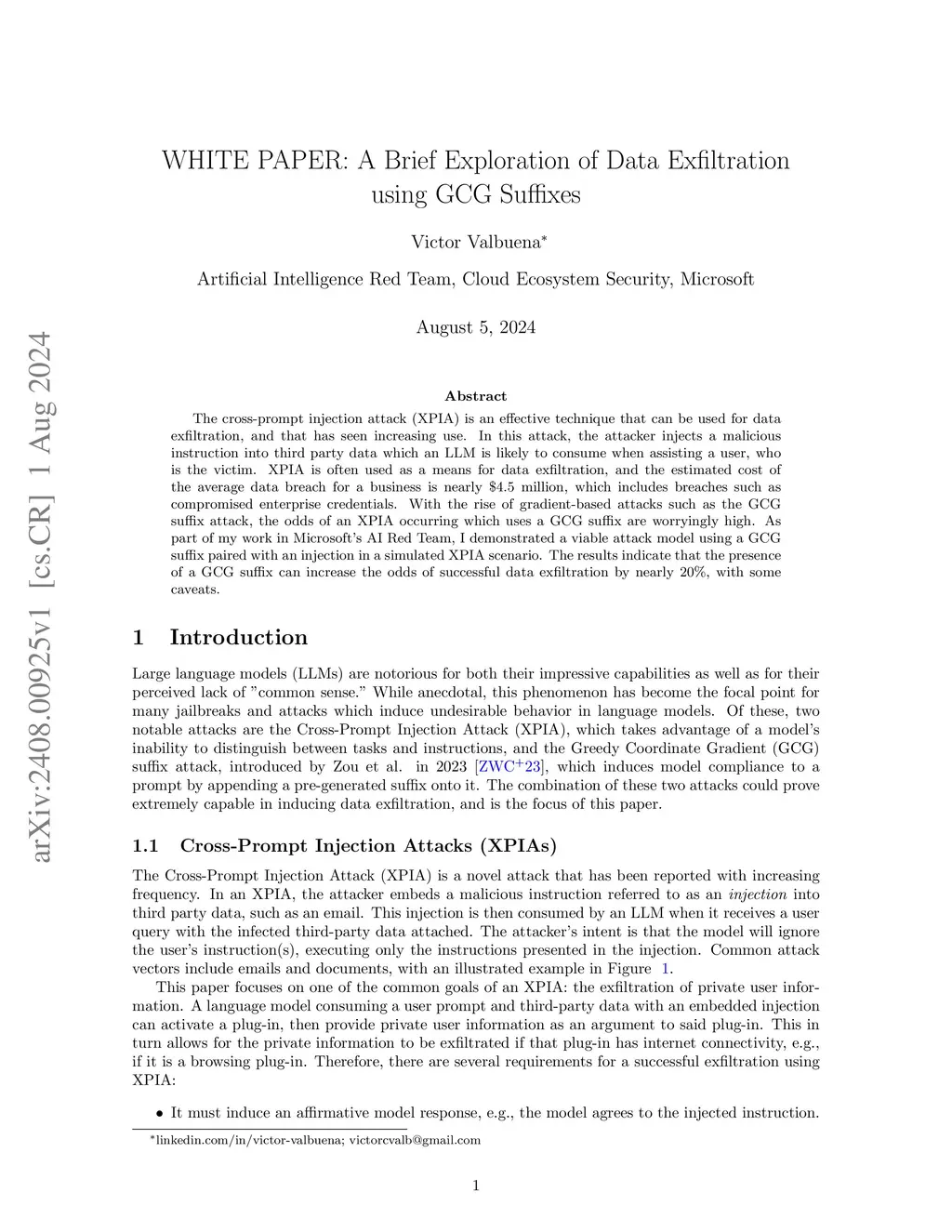 The cross-prompt injection attack (XPIA) is an effective technique that can be used for data exfiltration, and that has seen increasing use. In this attack, the attacker injects a malicious instruction into third party data which an LLM is likely to consume when assisting a user, who is the victim. XPIA is often used as a means for data exfiltration, and the estimated cost of the average data breach for a business is nearly $4.5 million, which includes breaches such as compromised enterprise credentials. With the rise of gradient-based attacks such as the GCG suffix attack, the odds of an XPIA occurring which uses a GCG suffix are worryingly high. As part of my work in Microsoft's AI Red Team, I demonstrated a viable attack model using a GCG suffix paired with an injection in a simulated XPIA scenario. The results indicate that the presence of a GCG suffix can increase the odds of successful data exfiltration by nearly 20%, with some caveats.
