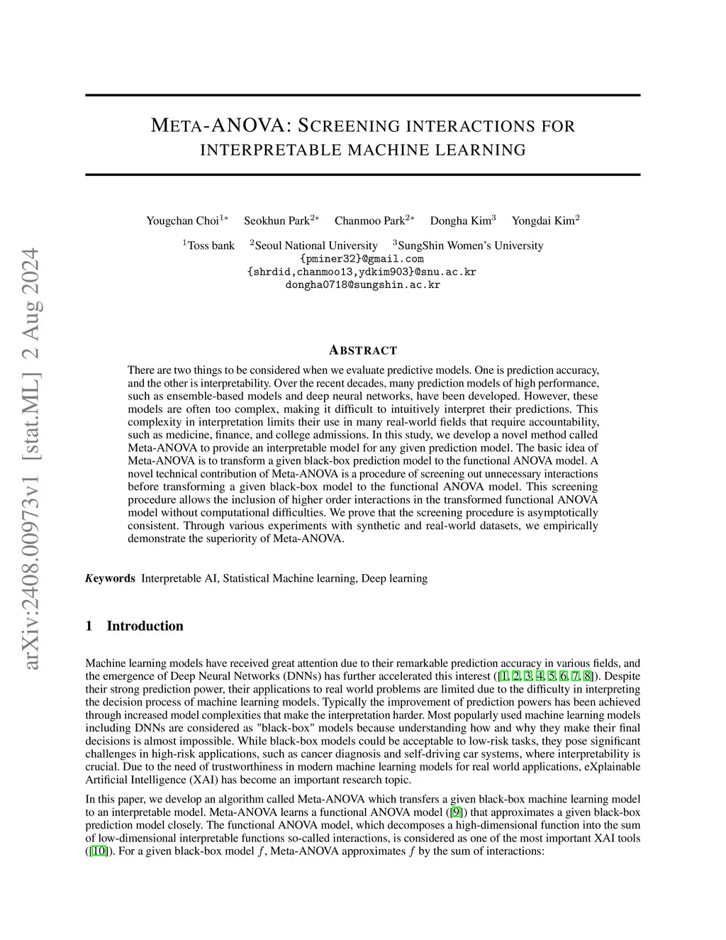 There are two things to be considered when we evaluate predictive models. One is prediction accuracy,and the other is interpretability. Over the recent decades, many prediction models of high performance, such as ensemble-based models and deep neural networks, have been developed. However, these models are often too complex, making it difficult to intuitively interpret their predictions. This complexity in interpretation limits their use in many real-world fields that require accountability, such as medicine, finance, and college admissions. In this study, we develop a novel method called Meta-ANOVA to provide an interpretable model for any given prediction model. The basic idea of Meta-ANOVA is to transform a given black-box prediction model to the functional ANOVA model. A novel technical contribution of Meta-ANOVA is a procedure of screening out unnecessary interaction before transforming a given black-box model to the functional ANOVA model. This screening procedure allows the inclusion of higher order interactions in the transformed functional ANOVA model without computational difficulties. We prove that the screening procedure is asymptotically consistent. Through various experiments with synthetic and real-world datasets, we empirically demonstrate the superiority of Meta-ANOVA