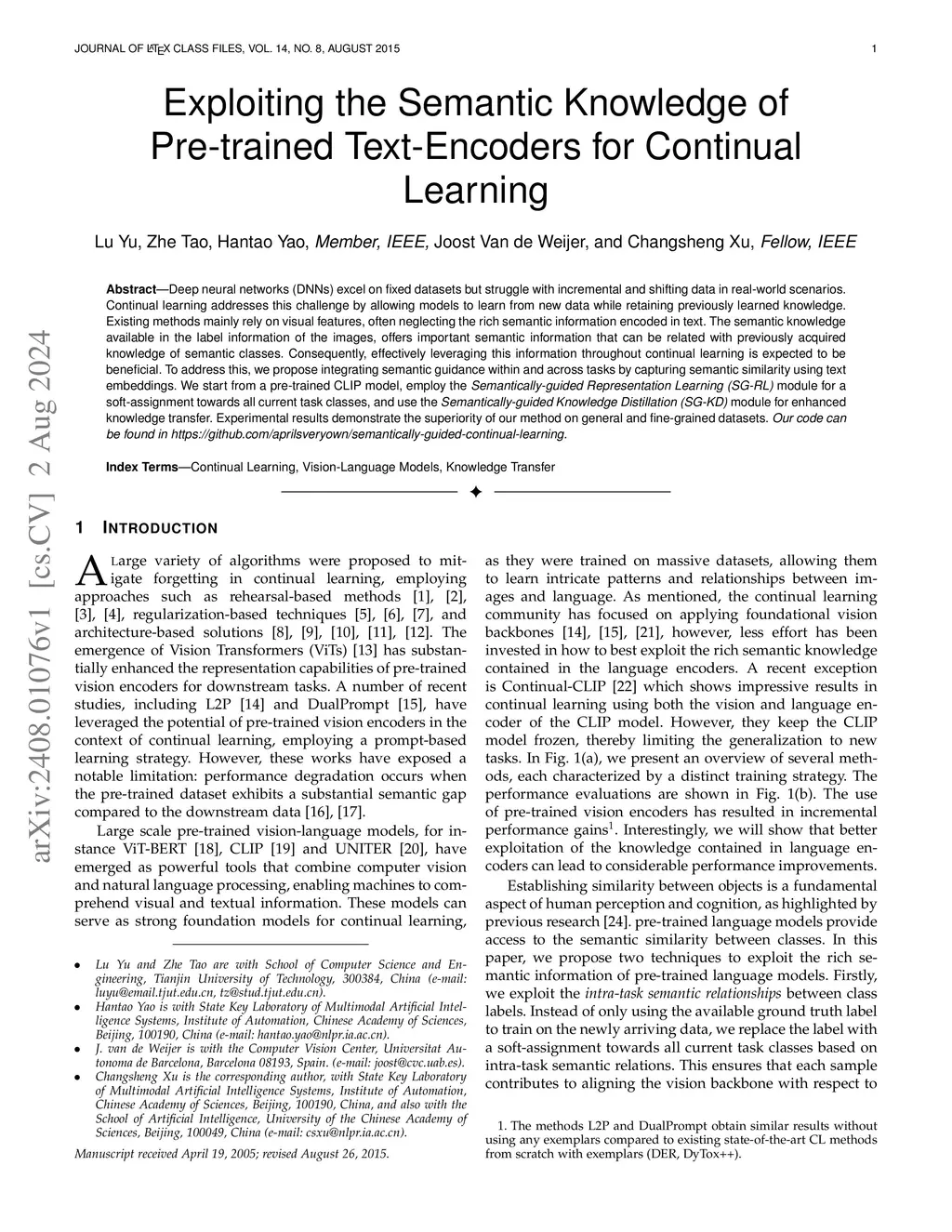 Deep neural networks (DNNs) excel on fixed datasets but struggle with incremental and shifting data in real-world scenarios. Continual learning addresses this challenge by allowing models to learn from new data while retaining previously learned knowledge. Existing methods mainly rely on visual features, often neglecting the rich semantic information encoded in text. The semantic knowledge available in the label information of the images, offers important semantic information that can be related with previously acquired knowledge of semantic classes. Consequently, effectively leveraging this information throughout continual learning is expected to be beneficial. To address this, we propose integrating semantic guidance within and across tasks by capturing semantic similarity using text embeddings. We start from a pre-trained CLIP model, employ the \emph{Semantically-guided Representation Learning (SG-RL)} module for a soft-assignment towards all current task classes, and use the Semantically-guided Knowledge Distillation (SG-KD) module for enhanced knowledge transfer. Experimental results demonstrate the superiority of our method on general and fine-grained datasets. Our code can be found inthis https URL.