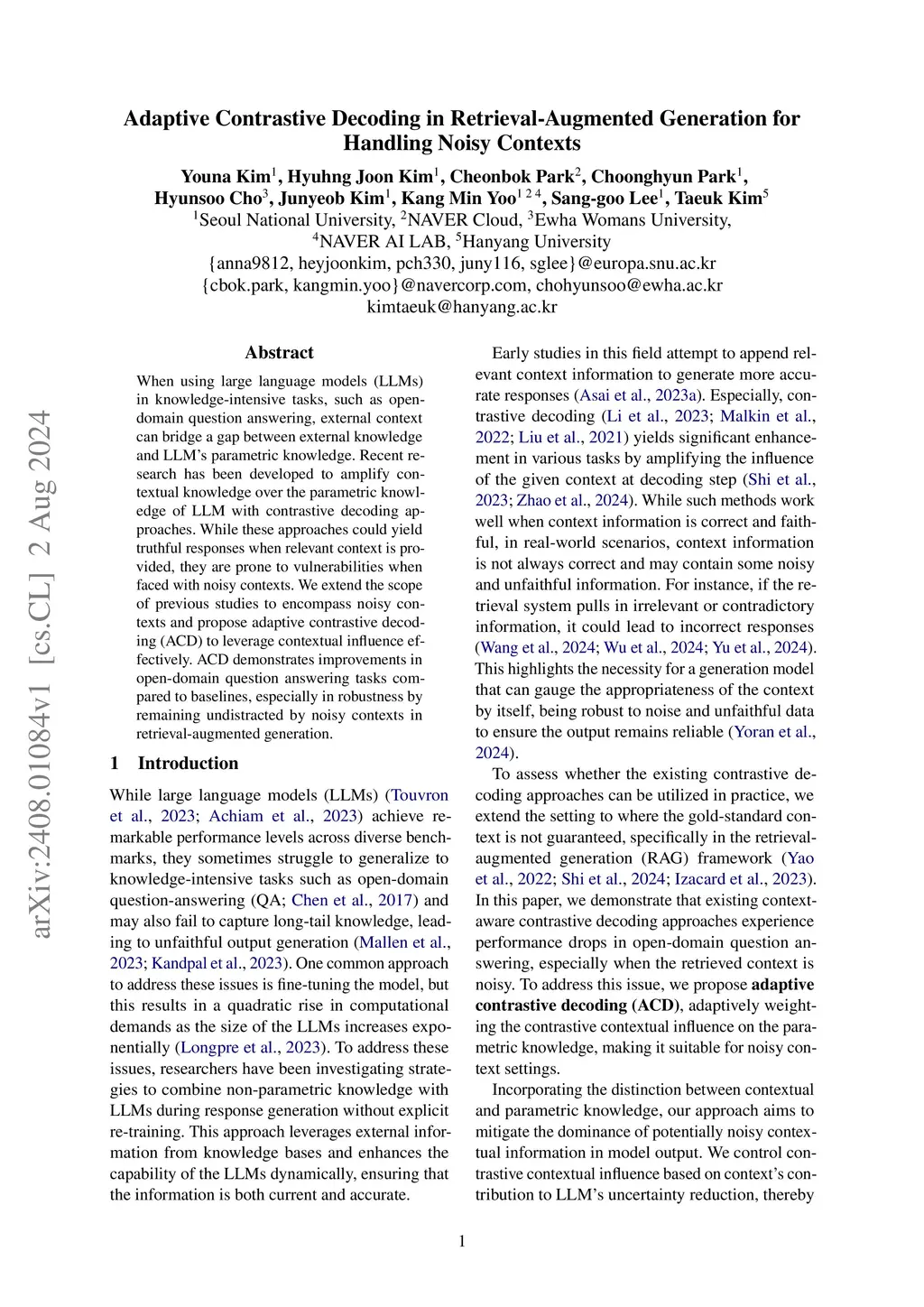 When using large language models (LLMs) in knowledge-intensive tasks, such as open-domain question answering, external context can bridge a gap between external knowledge and LLM's parametric knowledge. Recent research has been developed to amplify contextual knowledge over the parametric knowledge of LLM with contrastive decoding approaches. While these approaches could yield truthful responses when relevant context is provided, they are prone to vulnerabilities when faced with noisy contexts. We extend the scope of previous studies to encompass noisy contexts and propose adaptive contrastive decoding (ACD) to leverage contextual influence effectively. ACD demonstrates improvements in open-domain question answering tasks compared to baselines, especially in robustness by remaining undistracted by noisy contexts in retrieval-augmented generation.
