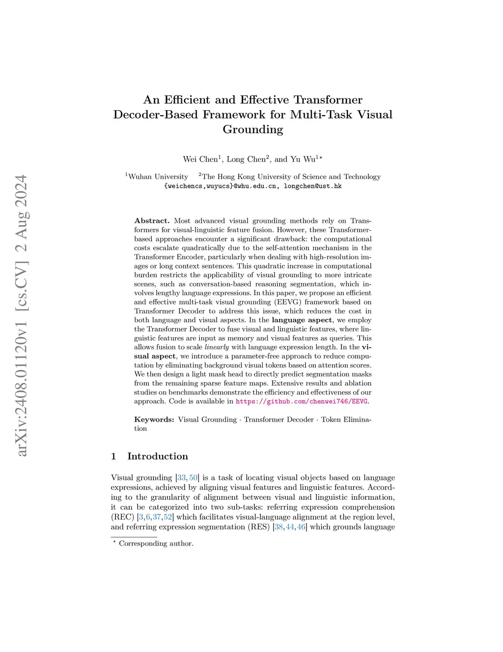 Most advanced visual grounding methods rely on Transformers for visual-linguistic feature fusion. However, these Transformer-based approaches encounter a significant drawback: the computational costs escalate quadratically due to the self-attention mechanism in the Transformer Encoder, particularly when dealing with high-resolution images or long context sentences. This quadratic increase in computational burden restricts the applicability of visual grounding to more intricate scenes, such as conversation-based reasoning segmentation, which involves lengthy language expressions. In this paper, we propose an efficient and effective multi-task visual grounding (EEVG) framework based on Transformer Decoder to address this issue, which reduces the cost in both language and visual aspects. In the language aspect, we employ the Transformer Decoder to fuse visual and linguistic features, where linguistic features are input as memory and visual features as queries. This allows fusion to scale linearly with language expression length. In the visual aspect, we introduce a parameter-free approach to reduce computation by eliminating background visual tokens based on attention scores. We then design a light mask head to directly predict segmentation masks from the remaining sparse feature maps. Extensive results and ablation studies on benchmarks demonstrate the efficiency and effectiveness of our approach. Code is available in https://github.com/chenwei746/EEVG.