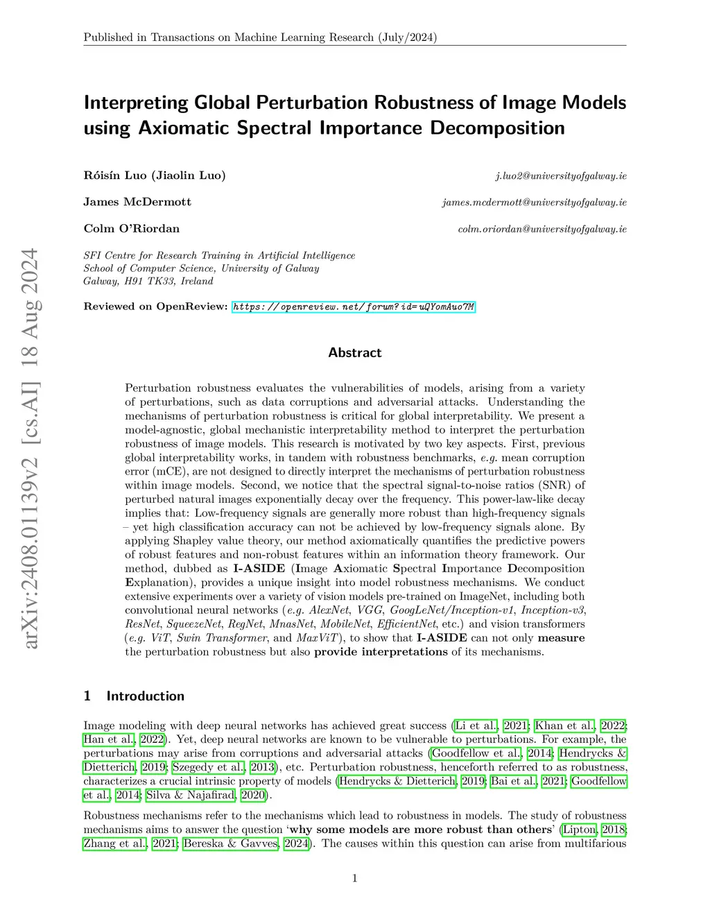 Perturbation robustness evaluates the vulnerabilities of models, arising from a variety of perturbations, such as data corruptions and adversarial attacks. Understanding the mechanisms of perturbation robustness is critical for global interpretability. We present a model-agnostic, global mechanistic interpretability method to interpret the perturbation robustness of image models. This research is motivated by two key aspects. First, previous global interpretability works, in tandem with robustness benchmarks, e.g. mean corruption error (mCE), are not designed to directly interpret the mechanisms of perturbation robustness within image models. Second, we notice that the spectral signal-to-noise ratios (SNR) of perturbed natural images exponentially decay over the frequency. This power-law-like decay implies that: Low-frequency signals are generally more robust than high-frequency signals -- yet high classification accuracy can not be achieved by low-frequency signals alone. By applying Shapley value theory, our method axiomatically quantifies the predictive powers of robust features and non-robust features within an information theory framework. Our method, dubbed as \textbf{I-ASIDE} (\textbf{I}mage \textbf{A}xiomatic \textbf{S}pectral \textbf{I}mportance \textbf{D}ecomposition \textbf{E}xplanation), provides a unique insight into model robustness mechanisms. We conduct extensive experiments over a variety of vision models pre-trained on ImageNet to show that \textbf{I-ASIDE} can not only \textbf{measure} the perturbation robustness but also \textbf{provide interpretations} of its mechanisms.