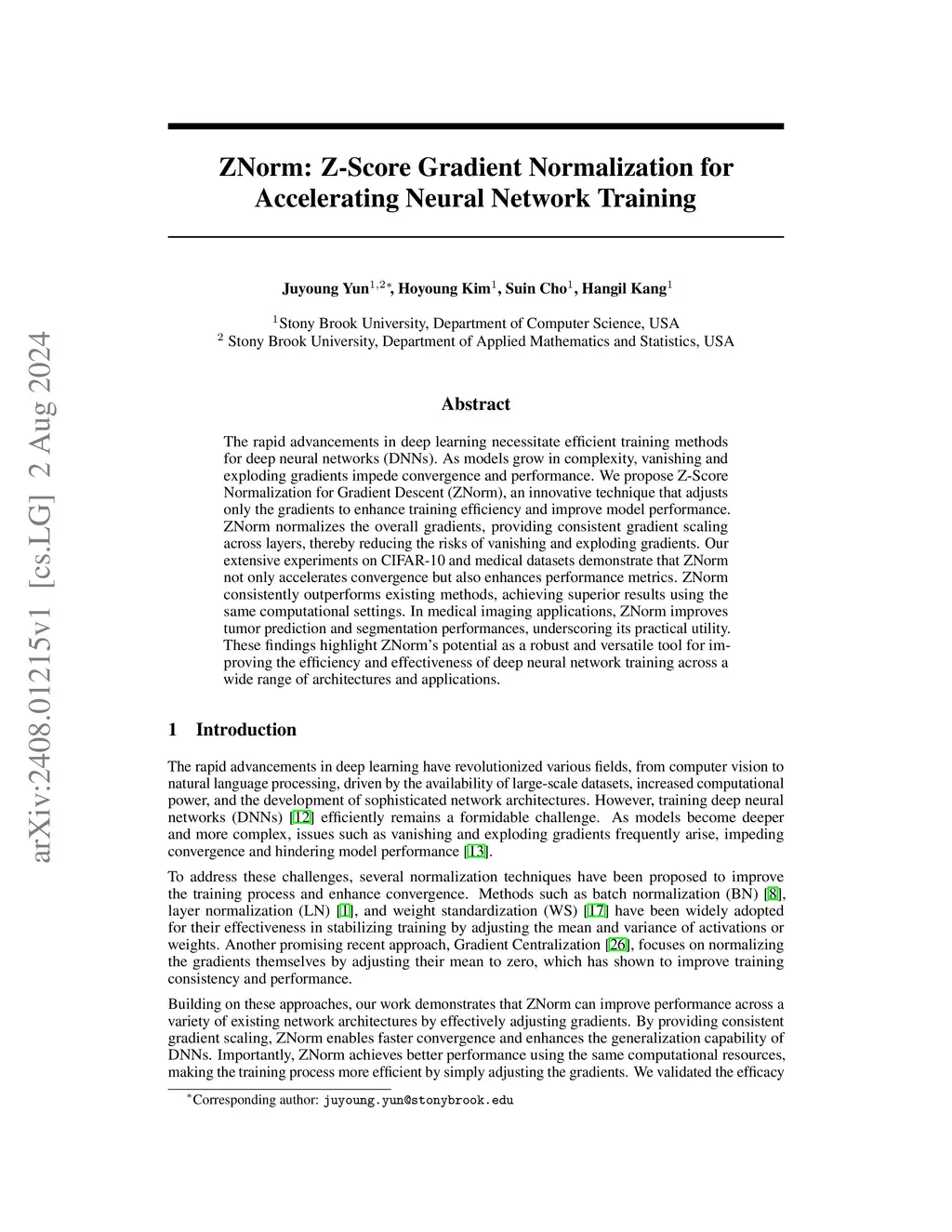 The rapid advancements in deep learning necessitate better training methods for deep neural networks (DNNs). As models grow in complexity, vanishing and exploding gradients impede performance. We propose Z-Score Normalization for Gradient Descent (ZNorm), an innovative technique that adjusts only the gradients to accelerate training and improve model performance. ZNorm normalizes the overall gradients, providing consistent gradient scaling across layers, thereby reducing the risks of vanishing and exploding gradients, having better performances. Our extensive experiments on CIFAR-10 and medical datasets demonstrate that ZNorm enhances performance metrics. ZNorm consistently outperforms existing methods, achieving superior results using the same experimental settings. In medical imaging applications, ZNorm improves tumor prediction and segmentation performances, underscoring its practical utility. These findings highlight ZNorm's potential as a robust and versatile tool for enhancing the training speed and effectiveness of deep neural networks across a wide range of architectures and applications.