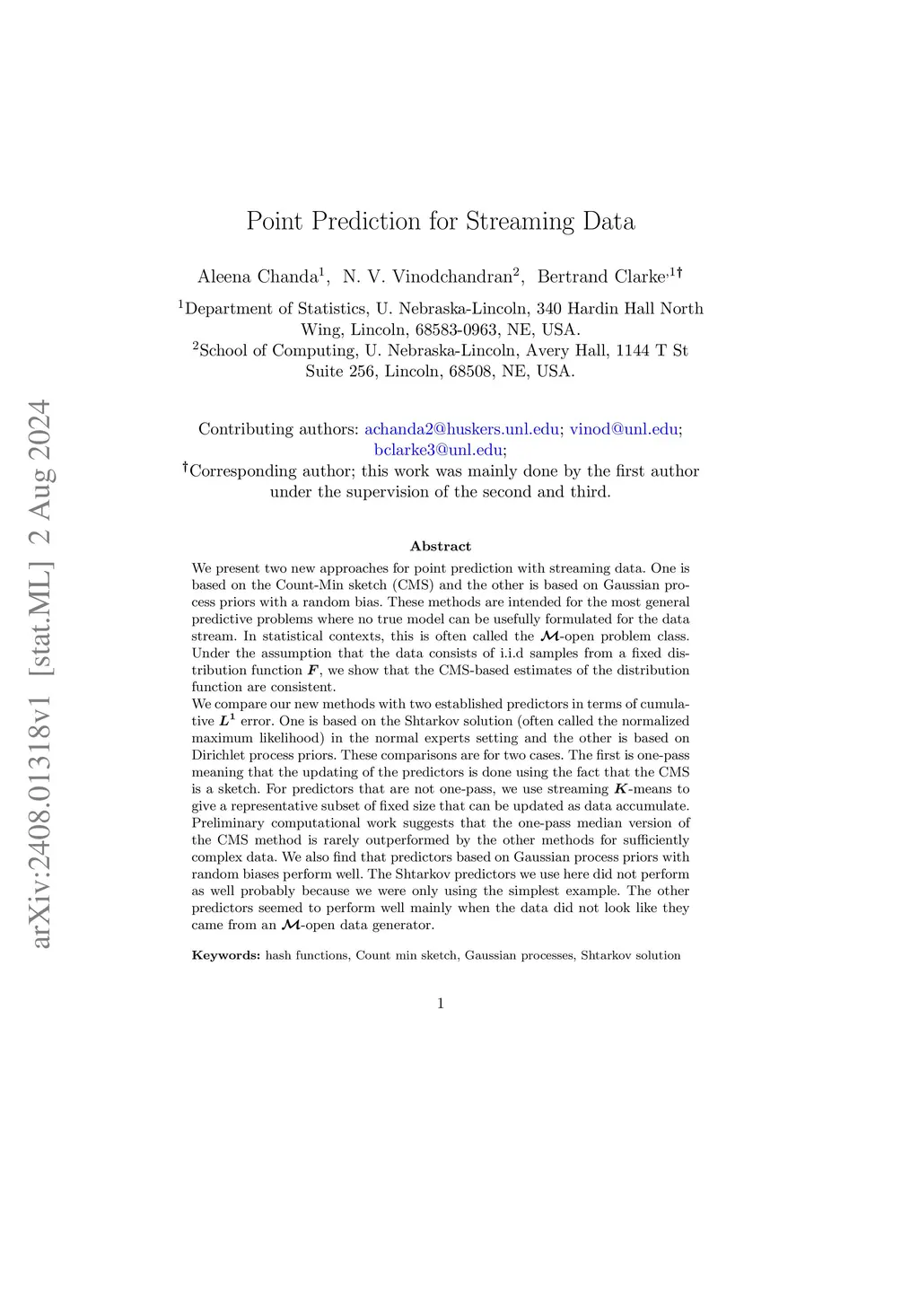 We present two new approaches for point prediction with streaming data. One is based on the Count-Min sketch (CMS) and the other is based on Gaussian process priors with a random bias. These methods are intended for the most general predictive problems where no true model can be usefully formulated for the data stream. In statistical contexts, this is often called the -open problem class. Under the assumption that the data consists of i.i.d samples from a fixed distribution function , we show that the CMS-based estimates of the distribution function are consistent. We compare our new methods with two established predictors in terms of cumulative error. One is based on the Shtarkov solution (often called the normalized maximum likelihood) in the normal experts setting and the other is based on Dirichlet process priors. These comparisons are for two cases. The first is one-pass meaning that the updating of the predictors is done using the fact that the CMS is a sketch. For predictors that are not one-pass, we use streaming -means to give a representative subset of fixed size that can be updated as data accumulate. Preliminary computational work suggests that the one-pass median version of the CMS method is rarely outperformed by the other methods for sufficiently complex data. We also find that predictors based on Gaussian process priors with random biases perform well. The Shtarkov predictors we use here did not perform as well probably because we were only using the simplest example. The other predictors seemed to perform well mainly when the data did not look like they came from an M-open data generator.