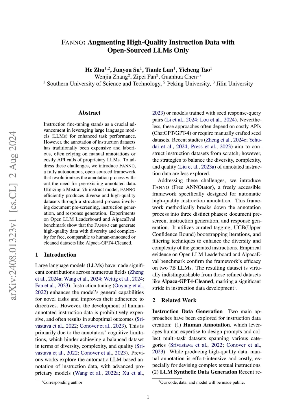 Instruction fine-tuning stands as a crucial advancement in leveraging large language models (LLMs) for enhanced task performance. However, the annotation of instruction datasets has traditionally been expensive and laborious, often relying on manual annotations or costly API calls of proprietary LLMs. To address these challenges, we introduce FANNO, a fully autonomous, open-sourced framework that revolutionizes the annotation process without the need for pre-existing annotated data. Utilizing a Mistral-7b-instruct model, FANNO efficiently produces diverse and high-quality datasets through a structured process involving document pre-screening, instruction generation, and response generation. Experiments on Open LLM Leaderboard and AlpacaEval benchmark show that the FANNO can generate high-quality data with diversity and complexity for free, comparable to human-annotated or cleaned datasets like Alpaca-GPT4-Cleaned.