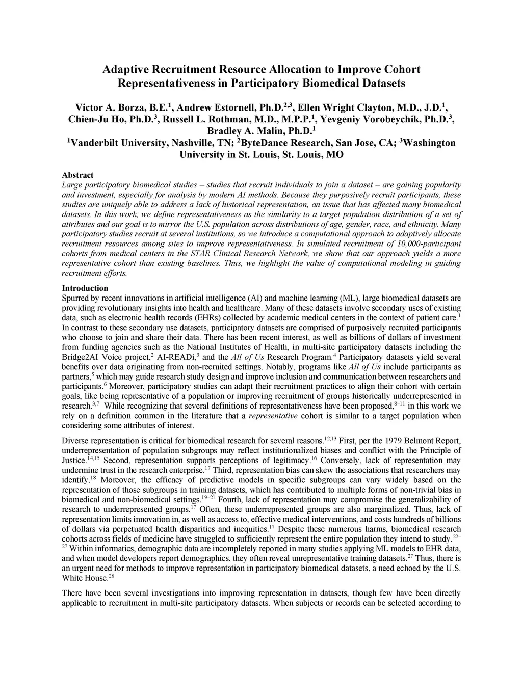 Large participatory biomedical studies, studies that recruit individuals to join a dataset, are gaining popularity and investment, especially for analysis by modern AI methods. Because they purposively recruit participants, these studies are uniquely able to address a lack of historical representation, an issue that has affected many biomedical datasets. In this work, we define representativeness as the similarity to a target population distribution of a set of attributes and our goal is to mirror the U.S. population across distributions of age, gender, race, and ethnicity. Many participatory studies recruit at several institutions, so we introduce a computational approach to adaptively allocate recruitment resources among sites to improve representativeness. In simulated recruitment of 10,000-participant cohorts from medical centers in the STAR Clinical Research Network, we show that our approach yields a more representative cohort than existing baselines. Thus, we highlight the value of computational modeling in guiding recruitment efforts.