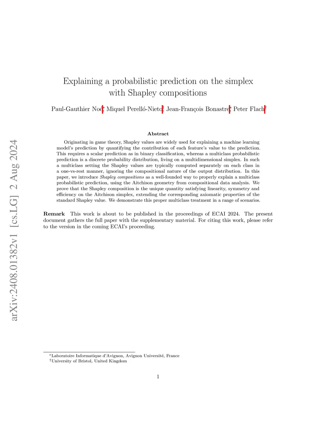 Originating in game theory, Shapley values are widely used for explaining a machine learning model's prediction by quantifying the contribution of each feature's value to the prediction. This requires a scalar prediction as in binary classification, whereas a multiclass probabilistic prediction is a discrete probability distribution, living on a multidimensional simplex. In such a multiclass setting the Shapley values are typically computed separately on each class in a one-vs-rest manner, ignoring the compositional nature of the output distribution. In this paper, we introduce Shapley compositions as a well-founded way to properly explain a multiclass probabilistic prediction, using the Aitchison geometry from compositional data analysis. We prove that the Shapley composition is the unique quantity satisfying linearity, symmetry and efficiency on the Aitchison simplex, extending the corresponding axiomatic properties of the standard Shapley value. We demonstrate this proper multiclass treatment in a range of scenarios.