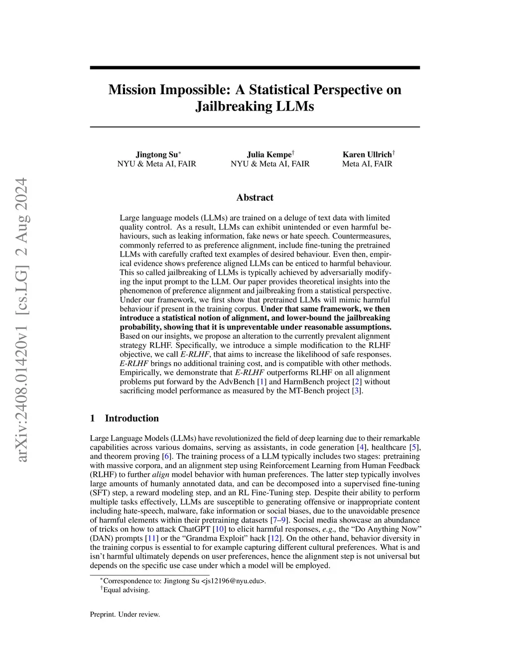 Large language models (LLMs) are trained on a deluge of text data with limited quality control. As a result, LLMs can exhibit unintended or even harmful behaviours, such as leaking information, fake news or hate speech. Countermeasures, commonly referred to as preference alignment, include fine-tuning the pretrained LLMs with carefully crafted text examples of desired behaviour. Even then, empirical evidence shows preference aligned LLMs can be enticed to harmful behaviour. This so called jailbreaking of LLMs is typically achieved by adversarially modifying the input prompt to the LLM. Our paper provides theoretical insights into the phenomenon of preference alignment and jailbreaking from a statistical perspective. Under our framework, we first show that pretrained LLMs will mimic harmful behaviour if present in the training corpus. Under that same framework, we then introduce a statistical notion of alignment, and lower-bound the jailbreaking probability, showing that it is unpreventable under reasonable assumptions. Based on our insights, we propose an alteration to the currently prevalent alignment strategy RLHF. Specifically, we introduce a simple modification to the RLHF objective, we call E-RLHF, that aims to increase the likelihood of safe responses. E-RLHF brings no additional training cost, and is compatible with other methods. Empirically, we demonstrate that E-RLHF outperforms RLHF on all alignment problems put forward by the AdvBench and HarmBench project without sacrificing model performance as measured by the MT-Bench project.