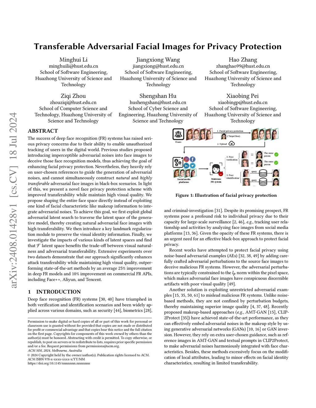The success of deep face recognition (FR) systems has raised serious privacy concerns due to their ability to enable unauthorized tracking of users in the digital world. Previous studies proposed introducing imperceptible adversarial noises into face images to deceive those face recognition models, thus achieving the goal of enhancing facial privacy protection. Nevertheless, they heavily rely on user-chosen references to guide the generation of adversarial noises, and cannot simultaneously construct natural and highly transferable adversarial face images in black-box scenarios. In light of this, we present a novel face privacy protection scheme with improved transferability while maintain high visual quality. We propose shaping the entire face space directly instead of exploiting one kind of facial characteristic like makeup information to integrate adversarial noises. To achieve this goal, we first exploit global adversarial latent search to traverse the latent space of the generative model, thereby creating natural adversarial face images with high transferability. We then introduce a key landmark regularization module to preserve the visual identity information. Finally, we investigate the impacts of various kinds of latent spaces and find that latent space benefits the trade-off between visual naturalness and adversarial transferability. Extensive experiments over two datasets demonstrate that our approach significantly enhances attack transferability while maintaining high visual quality, outperforming state-of-the-art methods by an average 25% improvement in deep FR models and 10% improvement on commercial FR APIs, including Face++, Aliyun, and Tencent.