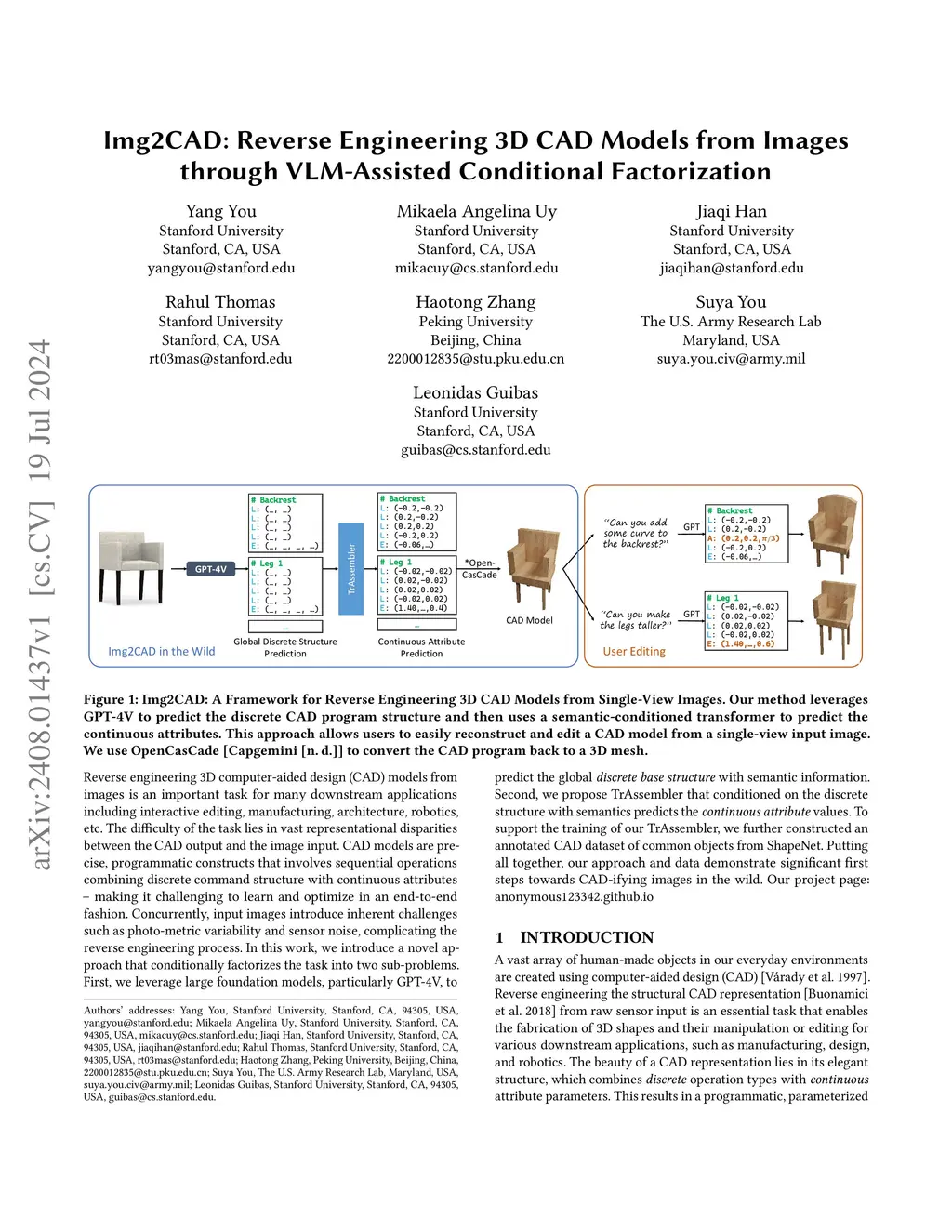 Reverse engineering 3D computer-aided design (CAD) models from images is an important task for many downstream applications including interactive editing, manufacturing, architecture, robotics, etc. The difficulty of the task lies in vast representational disparities between the CAD output and the image input. CAD models are precise, programmatic constructs that involve sequential operations combining discrete command structure with continuous attributes, making it challenging to learn and optimize in an end-to-end fashion. Concurrently, input images introduce inherent challenges such as photometric variability and sensor noise, complicating the reverse engineering process. In this work, we introduce a novel approach that conditionally factorizes the task into two sub-problems. First, we leverage vision-language foundation models (VLMs), a finetuned Llama3.2, to predict the global discrete base structure with semantic information. Second, we propose TrAssembler that, conditioned on the discrete structure with semantics, predicts the continuous attribute values. To support the training of our TrAssembler, we further constructed an annotated CAD dataset of common objects from ShapeNet. Putting all together, our approach and data demonstrate significant first steps towards CAD-ifying images in the wild. Code and data can be found inthis https URL.