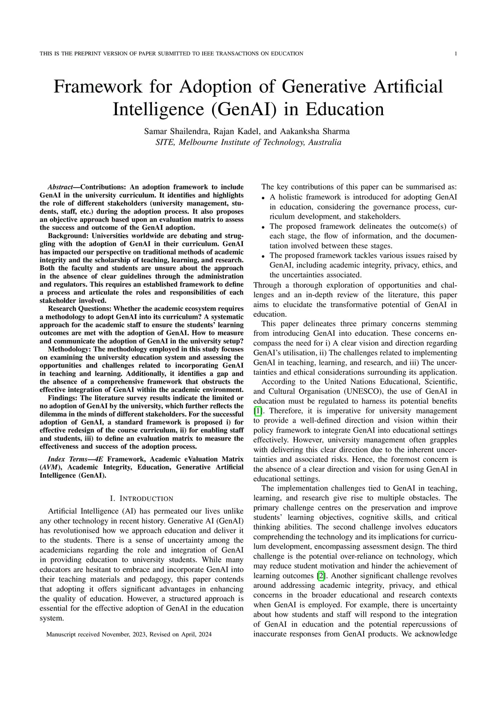 Contributions: An adoption framework to include GenAI in the university curriculum. It identifies and highlights the role of different stakeholders (university management, students, staff, etc.) during the adoption process. It also proposes an objective approach based upon an evaluation matrix to assess the success and outcome of the GenAI adoption. Background: Universities worldwide are debating and struggling with the adoption of GenAI in their curriculum. Both the faculty and students are unsure about the approach in the absence of clear guidelines through the administration and regulators. This requires an established framework to define a process and articulate the roles and responsibilities of each stakeholder involved. Research Questions: Whether the academic ecosystem requires a methodology to adopt GenAI into its curriculum? A systematic approach for the academic staff to ensure the students' learning outcomes are met with the adoption of GenAI. How to measure and communicate the adoption of GenAI in the university setup? Methodology: The methodology employed in this study focuses on examining the university education system and assessing the opportunities and challenges related to incorporating GenAI in teaching and learning. Additionally, it identifies a gap and the absence of a comprehensive framework that obstructs the effective integration of GenAI within the academic environment. Findings: The literature survey results indicate the limited or no adoption of GenAI by the university, which further reflects the dilemma in the minds of different stakeholders. For the successful adoption of GenAI, a standard framework is proposed i) for effective redesign of the course curriculum, ii) for enabling staff and students, iii) to define an evaluation matrix to measure the effectiveness and success of the adoption process.