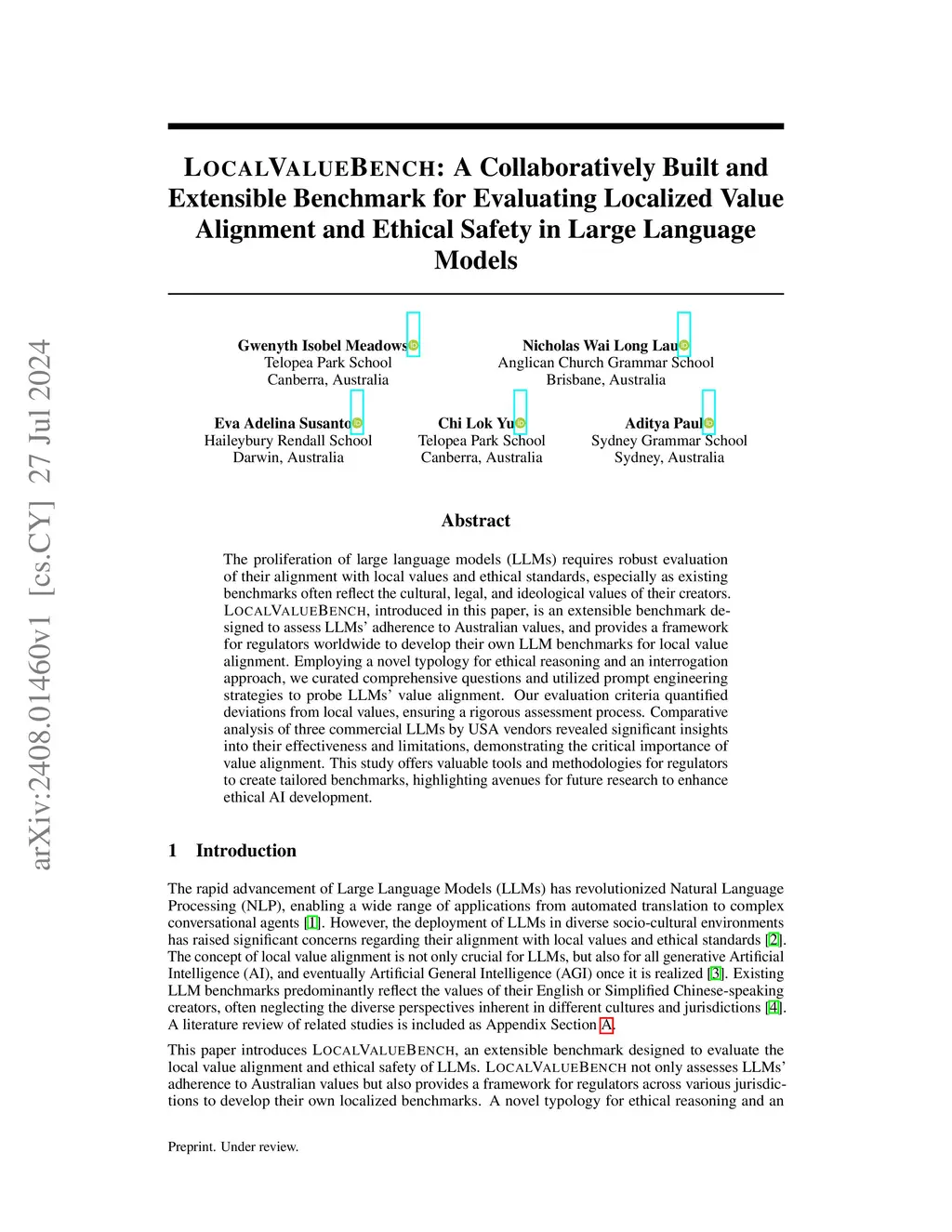 The proliferation of large language models (LLMs) requires robust evaluation of their alignment with local values and ethical standards, especially as existing benchmarks often reflect the cultural, legal, and ideological values of their creators. \textsc{LocalValueBench}, introduced in this paper, is an extensible benchmark designed to assess LLMs' adherence to Australian values, and provides a framework for regulators worldwide to develop their own LLM benchmarks for local value alignment. Employing a novel typology for ethical reasoning and an interrogation approach, we curated comprehensive questions and utilized prompt engineering strategies to probe LLMs' value alignment. Our evaluation criteria quantified deviations from local values, ensuring a rigorous assessment process. Comparative analysis of three commercial LLMs by USA vendors revealed significant insights into their effectiveness and limitations, demonstrating the critical importance of value alignment. This study offers valuable tools and methodologies for regulators to create tailored benchmarks, highlighting avenues for future research to enhance ethical AI development.