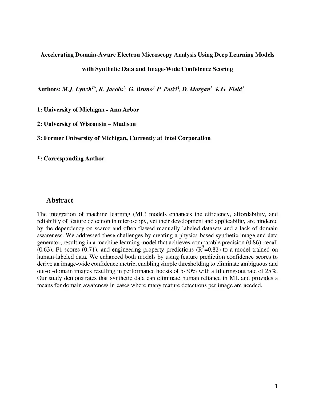 The integration of machine learning (ML) models enhances the efficiency, affordability, and reliability of feature detection in microscopy, yet their development and applicability are hindered by the dependency on scarce and often flawed manually labeled datasets and a lack of domain awareness. We addressed these challenges by creating a physics-based synthetic image and data generator, resulting in a machine learning model that achieves comparable precision (0.86), recall (0.63), F1 scores (0.71), and engineering property predictions (R2=0.82) to a model trained on human-labeled data. We enhanced both models by using feature prediction confidence scores to derive an image-wide confidence metric, enabling simple thresholding to eliminate ambiguous and out-of-domain images resulting in performance boosts of 5-30% with a filtering-out rate of 25%. Our study demonstrates that synthetic data can eliminate human reliance in ML and provides a means for domain awareness in cases where many feature detections per image are needed.