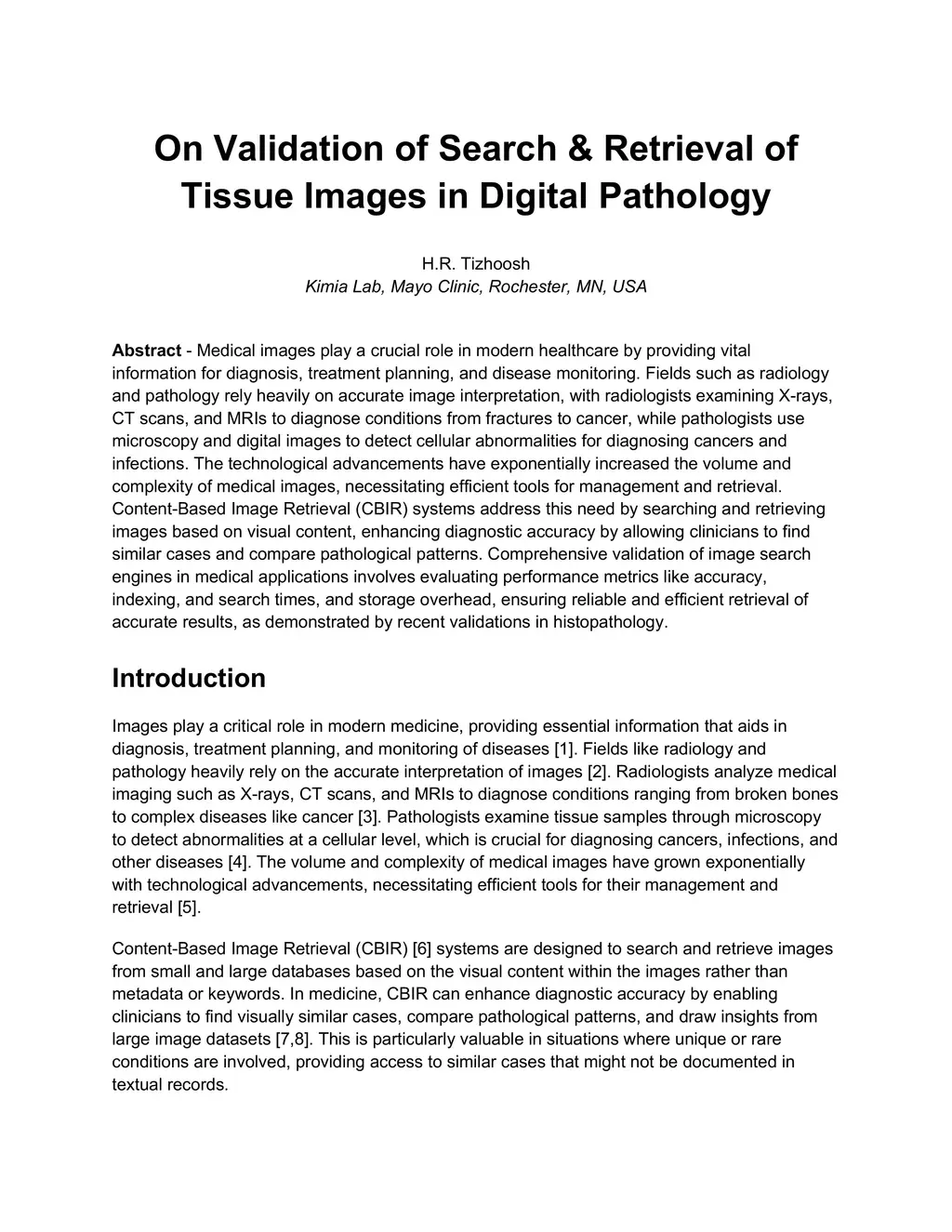 Medical images play a crucial role in modern healthcare by providing vital information for diagnosis, treatment planning, and disease monitoring. Fields such as radiology and pathology rely heavily on accurate image interpretation, with radiologists examining X-rays, CT scans, and MRIs to diagnose conditions from fractures to cancer, while pathologists use microscopy and digital images to detect cellular abnormalities for diagnosing cancers and infections. The technological advancements have exponentially increased the volume and complexity of medical images, necessitating efficient tools for management and retrieval. Content-Based Image Retrieval (CBIR) systems address this need by searching and retrieving images based on visual content, enhancing diagnostic accuracy by allowing clinicians to find similar cases and compare pathological patterns. Comprehensive validation of image search engines in medical applications involves evaluating performance metrics like accuracy, indexing, and search times, and storage overhead, ensuring reliable and efficient retrieval of accurate results, as demonstrated by recent validations in histopathology.