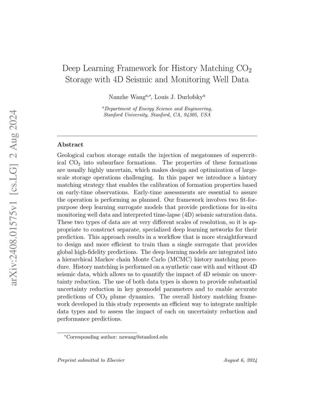 Geological carbon storage entails the injection of megatonnes of supercritical CO2 into subsurface formations. The properties of these formations are usually highly uncertain, which makes design and optimization of large-scale storage operations challenging. In this paper we introduce a history matching strategy that enables the calibration of formation properties based on early-time observations. Early-time assessments are essential to assure the operation is performing as planned. Our framework involves two fit-for-purpose deep learning surrogate models that provide predictions for in-situ monitoring well data and interpreted time-lapse (4D) seismic saturation data. These two types of data are at very different scales of resolution, so it is appropriate to construct separate, specialized deep learning networks for their prediction. This approach results in a workflow that is more straightforward to design and more efficient to train than a single surrogate that provides global high-fidelity predictions. The deep learning models are integrated into a hierarchical Markov chain Monte Carlo (MCMC) history matching procedure. History matching is performed on a synthetic case with and without 4D seismic data, which allows us to quantify the impact of 4D seismic on uncertainty reduction. The use of both data types is shown to provide substantial uncertainty reduction in key geomodel parameters and to enable accurate predictions of CO2 plume dynamics. The overall history matching framework developed in this study represents an efficient way to integrate multiple data types and to assess the impact of each on uncertainty reduction and performance predictions.