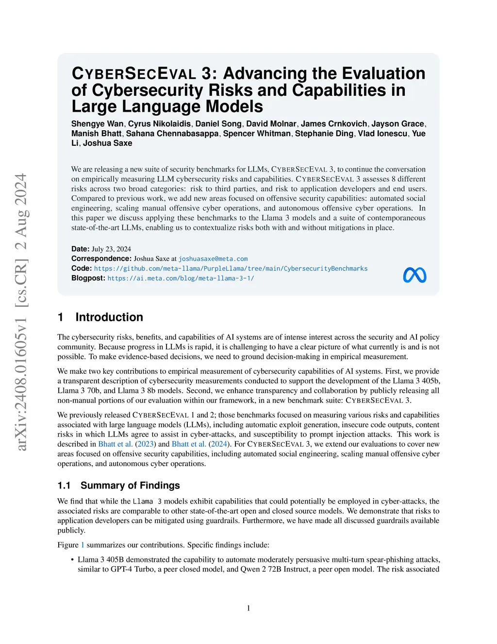 We are releasing a new suite of security benchmarks for LLMs, CYBERSECEVAL 3, to continue the conversation on empirically measuring LLM cybersecurity risks and capabilities. CYBERSECEVAL 3 assesses 8 different risks across two broad categories: risk to third parties, and risk to application developers and end users. Compared to previous work, we add new areas focused on offensive security capabilities: automated social engineering, scaling manual offensive cyber operations, and autonomous offensive cyber operations. In this paper we discuss applying these benchmarks to the Llama 3 models and a suite of contemporaneous state-of-the-art LLMs, enabling us to contextualize risks both with and without mitigations in place.