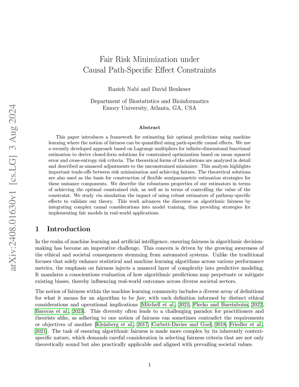 This paper introduces a framework for estimating fair optimal predictions using machine learning where the notion of fairness can be quantified using path-specific causal effects. We use a recently developed approach based on Lagrange multipliers for infinite-dimensional functional estimation to derive closed-form solutions for constrained optimization based on mean squared error and cross-entropy risk criteria. The theoretical forms of the solutions are analyzed in detail and described as nuanced adjustments to the unconstrained minimizer. This analysis highlights important trade-offs between risk minimization and achieving fairnes. The theoretical solutions are also used as the basis for construction of flexible semiparametric estimation strategies for these nuisance components. We describe the robustness properties of our estimators in terms of achieving the optimal constrained risk, as well as in terms of controlling the value of the constraint. We study via simulation the impact of using robust estimators of pathway-specific effects to validate our theory. This work advances the discourse on algorithmic fairness by integrating complex causal considerations into model training, thus providing strategies for implementing fair models in real-world applications.