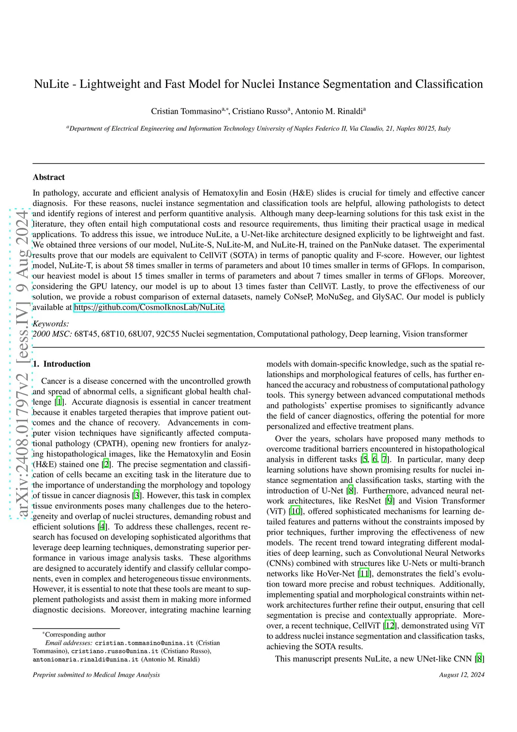 In pathology, accurate and efficient analysis of Hematoxylin and Eosin (H\&E) slides is crucial for timely and effective cancer diagnosis. Although many deep learning solutions for nuclei instance segmentation and classification exist in the literature, they often entail high computational costs and resource requirements, thus limiting their practical usage in medical applications. To address this issue, we introduce a novel convolutional neural network, NuLite, a U-Net-like architecture designed explicitly on Fast-ViT, a state-of-the-art (SOTA) lightweight CNN. We obtained three versions of our model, NuLite-S, NuLite-M, and NuLite-H, trained on the PanNuke dataset. The experimental results prove that our models equal CellViT (SOTA) in terms of panoptic quality and detection. However, our lightest model, NuLite-S, is 40 times smaller in terms of parameters and about 8 times smaller in terms of GFlops, while our heaviest model is 17 times smaller in terms of parameters and about 7 times smaller in terms of GFlops. Moreover, our model is up to about 8 times faster than CellViT. Lastly, to prove the effectiveness of our solution, we provide a robust comparison of external datasets, namely CoNseP, MoNuSeg, and GlySAC. Our model is publicly available at https://github.com/CosmoIknosLab/NuLite