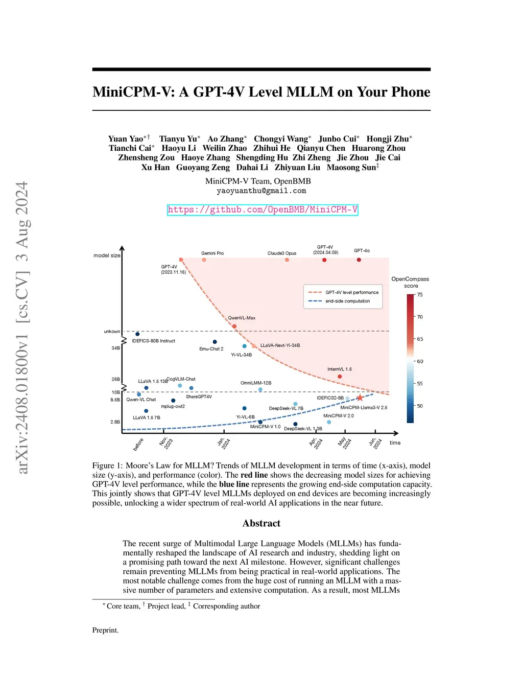 The recent surge of Multimodal Large Language Models (MLLMs) has fundamentally reshaped the landscape of AI research and industry, shedding light on a promising path toward the next AI milestone. However, significant challenges remain preventing MLLMs from being practical in real-world applications. The most notable challenge comes from the huge cost of running an MLLM with a massive number of parameters and extensive computation. As a result, most MLLMs need to be deployed on high-performing cloud servers, which greatly limits their application scopes such as mobile, offline, energy-sensitive, and privacy-protective scenarios. In this work, we present MiniCPM-V, a series of efficient MLLMs deployable on end-side devices. By integrating the latest MLLM techniques in architecture, pretraining and alignment, the latest MiniCPM-Llama3-V 2.5 has several notable features: (1) Strong performance, outperforming GPT-4V-1106, Gemini Pro and Claude 3 on OpenCompass, a comprehensive evaluation over 11 popular benchmarks, (2) strong OCR capability and 1.8M pixel high-resolution image perception at any aspect ratio, (3) trustworthy behavior with low hallucination rates, (4) multilingual support for 30+ languages, and (5) efficient deployment on mobile phones. More importantly, MiniCPM-V can be viewed as a representative example of a promising trend: The model sizes for achieving usable (e.g., GPT-4V) level performance are rapidly decreasing, along with the fast growth of end-side computation capacity. This jointly shows that GPT-4V level MLLMs deployed on end devices are becoming increasingly possible, unlocking a wider spectrum of real-world AI applications in the near future.