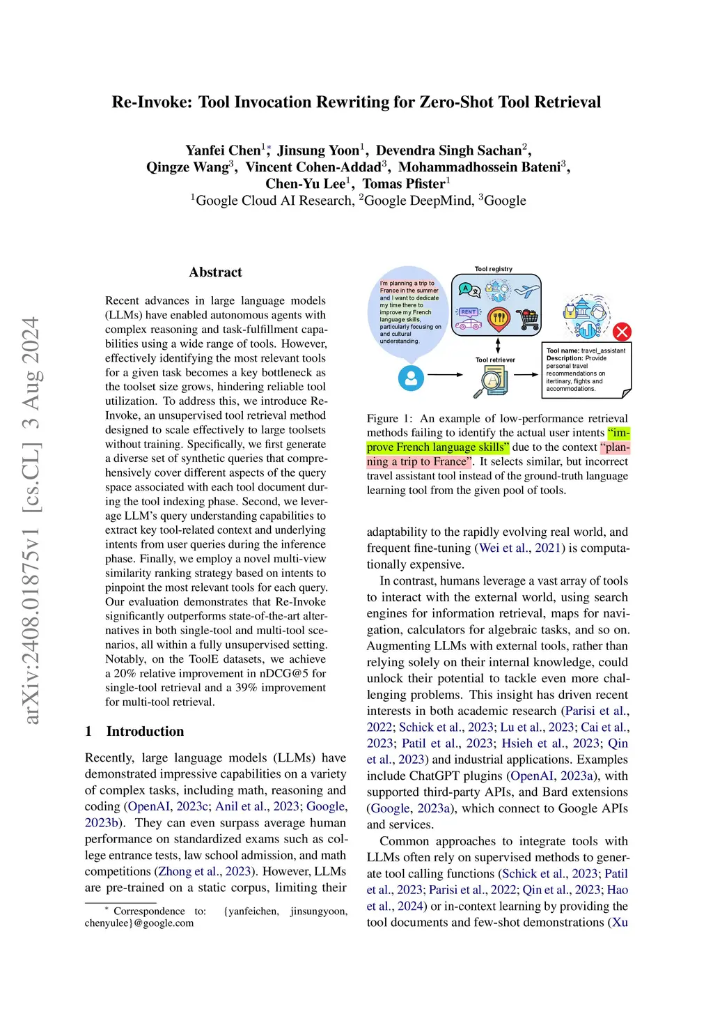 Recent advances in large language models (LLMs) have enabled autonomous agents with complex reasoning and task-fulfillment capabilities using a wide range of tools. However, effectively identifying the most relevant tools for a given task becomes a key bottleneck as the toolset size grows, hindering reliable tool utilization. To address this, we introduce Re-Invoke, an unsupervised tool retrieval method designed to scale effectively to large toolsets without training. Specifically, we first generate a diverse set of synthetic queries that comprehensively cover different aspects of the query space associated with each tool document during the tool indexing phase. Second, we leverage LLM's query understanding capabilities to extract key tool-related context and underlying intents from user queries during the inference phase. Finally, we employ a novel multi-view similarity ranking strategy based on intents to pinpoint the most relevant tools for each query. Our evaluation demonstrates that Re-Invoke significantly outperforms state-of-the-art alternatives in both single-tool and multi-tool scenarios, all within a fully unsupervised setting. Notably, on the ToolE datasets, we achieve a 20% relative improvement in nDCG@5 for single-tool retrieval and a 39% improvement for multi-tool retrieval.