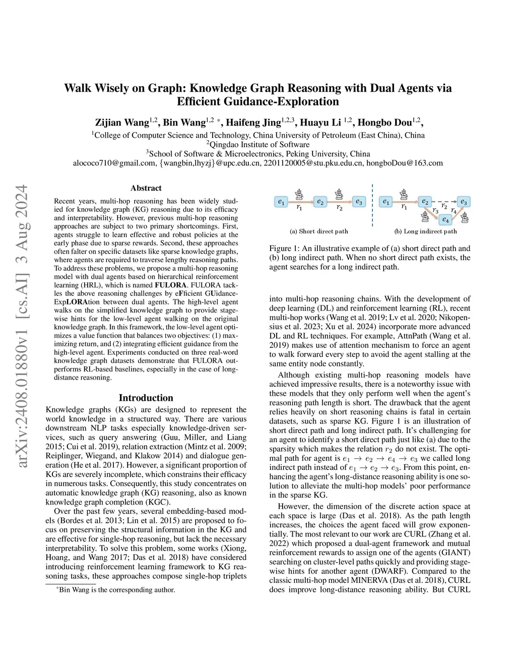 Recent years, multi-hop reasoning has been widely studied for knowledge graph (KG) reasoning due to its efficacy and interpretability. However, previous multi-hop reasoning approaches are subject to two primary shortcomings. First, agents struggle to learn effective and robust policies at the early phase due to sparse rewards. Second, these approaches often falter on specific datasets like sparse knowledge graphs, where agents are required to traverse lengthy reasoning paths. To address these problems, we propose a multi-hop reasoning model with dual agents based on hierarchical reinforcement learning (HRL), which is named FULORA. FULORA tackles the above reasoning challenges by eFficient GUidance-ExpLORAtion between dual agents. The high-level agent walks on the simplified knowledge graph to provide stage-wise hints for the low-level agent walking on the original knowledge graph. In this framework, the low-level agent optimizes a value function that balances two objectives: (1) maximizing return, and (2) integrating efficient guidance from the high-level agent. Experiments conducted on three real-word knowledge graph datasets demonstrate that FULORA outperforms RL-based baselines, especially in the case of long-distance reasoning.