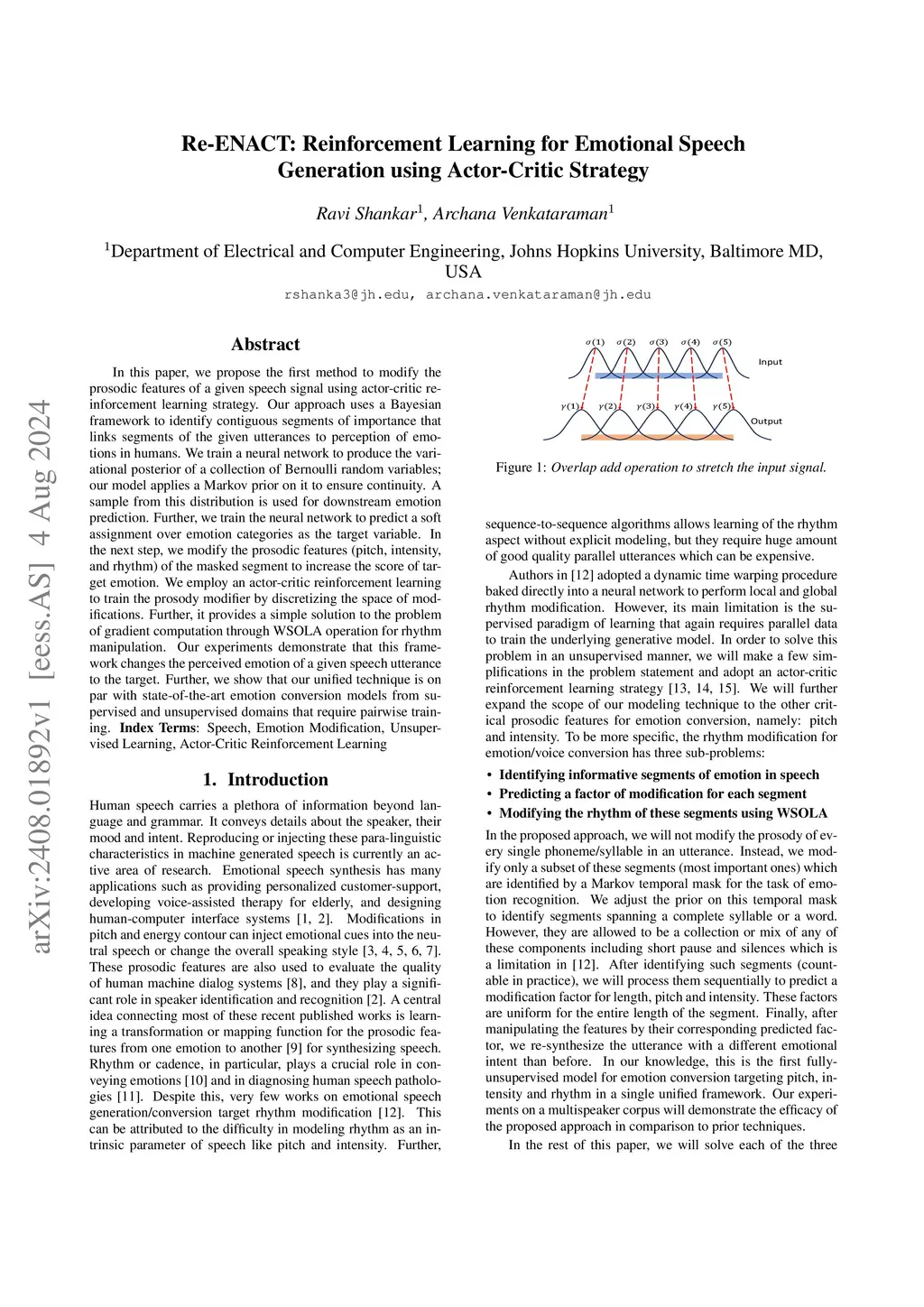 In this paper, we propose the first method to modify the prosodic features of a given speech signal using actor-critic reinforcement learning strategy. Our approach uses a Bayesian framework to identify contiguous segments of importance that links segments of the given utterances to perception of emotions in humans. We train a neural network to produce the variational posterior of a collection of Bernoulli random variables; our model applies a Markov prior on it to ensure continuity. A sample from this distribution is used for downstream emotion prediction. Further, we train the neural network to predict a soft assignment over emotion categories as the target variable. In the next step, we modify the prosodic features (pitch, intensity, and rhythm) of the masked segment to increase the score of target emotion. We employ an actor-critic reinforcement learning to train the prosody modifier by discretizing the space of modifications. Further, it provides a simple solution to the problem of gradient computation through WSOLA operation for rhythm manipulation. Our experiments demonstrate that this framework changes the perceived emotion of a given speech utterance to the target. Further, we show that our unified technique is on par with state-of-the-art emotion conversion models from supervised and unsupervised domains that require pairwise training.
