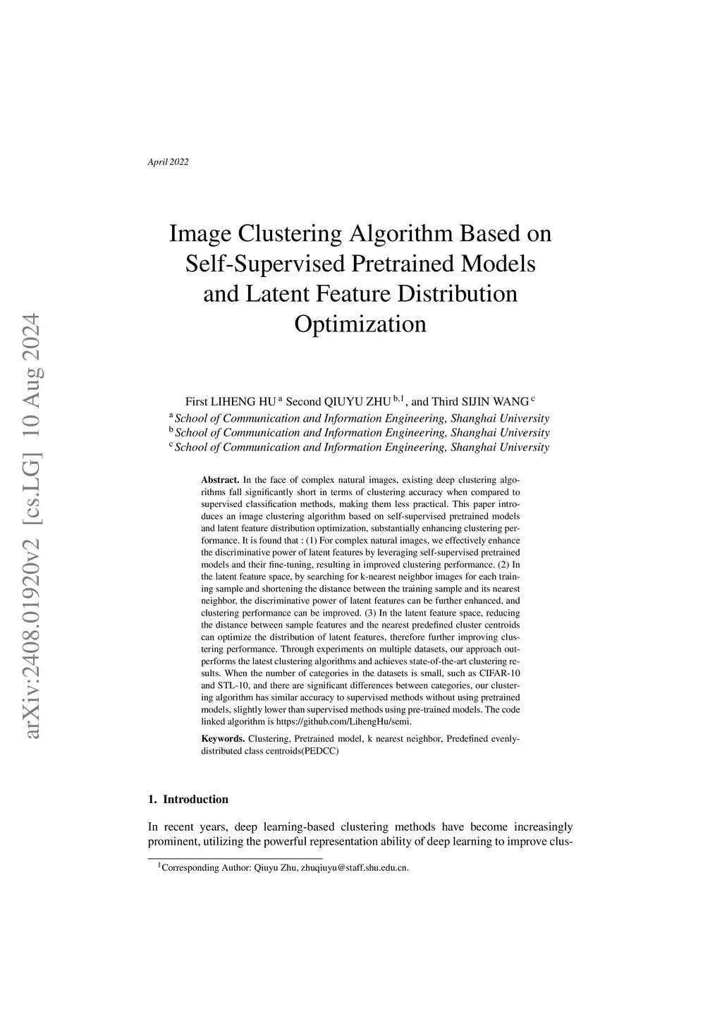 In the face of complex natural images, existing deep clustering algorithms fall significantly short in terms of clustering accuracy when compared to supervised classification methods, making them less practical. This paper introduces an image clustering algorithm based on self-supervised pretrained models and latent feature distribution optimization, substantially enhancing clustering performance. It is found that: (1) For complex natural images, we effectively enhance the discriminative power of latent features by leveraging self-supervised pretrained models and their fine-tuning, resulting in improved clustering performance. (2) In the latent feature space, by searching for k-nearest neighbor images for each training sample and shortening the distance between the training sample and its nearest neighbor, the discriminative power of latent features can be further enhanced, and clustering performance can be improved. (3) In the latent feature space, reducing the distance between sample features and the nearest predefined cluster centroids can optimize the distribution of latent features, therefore further improving clustering performance. Through experiments on multiple datasets, our approach outperforms the latest clustering algorithms and achieves state-of-the-art clustering results. When the number of categories in the datasets is small, such as CIFAR-10 and STL-10, and there are significant differences between categories, our clustering algorithm has similar accuracy to supervised methods without using pretrained models, slightly lower than supervised methods using pre-trained models. The code linked algorithm is https://github.com/LihengHu/semi.