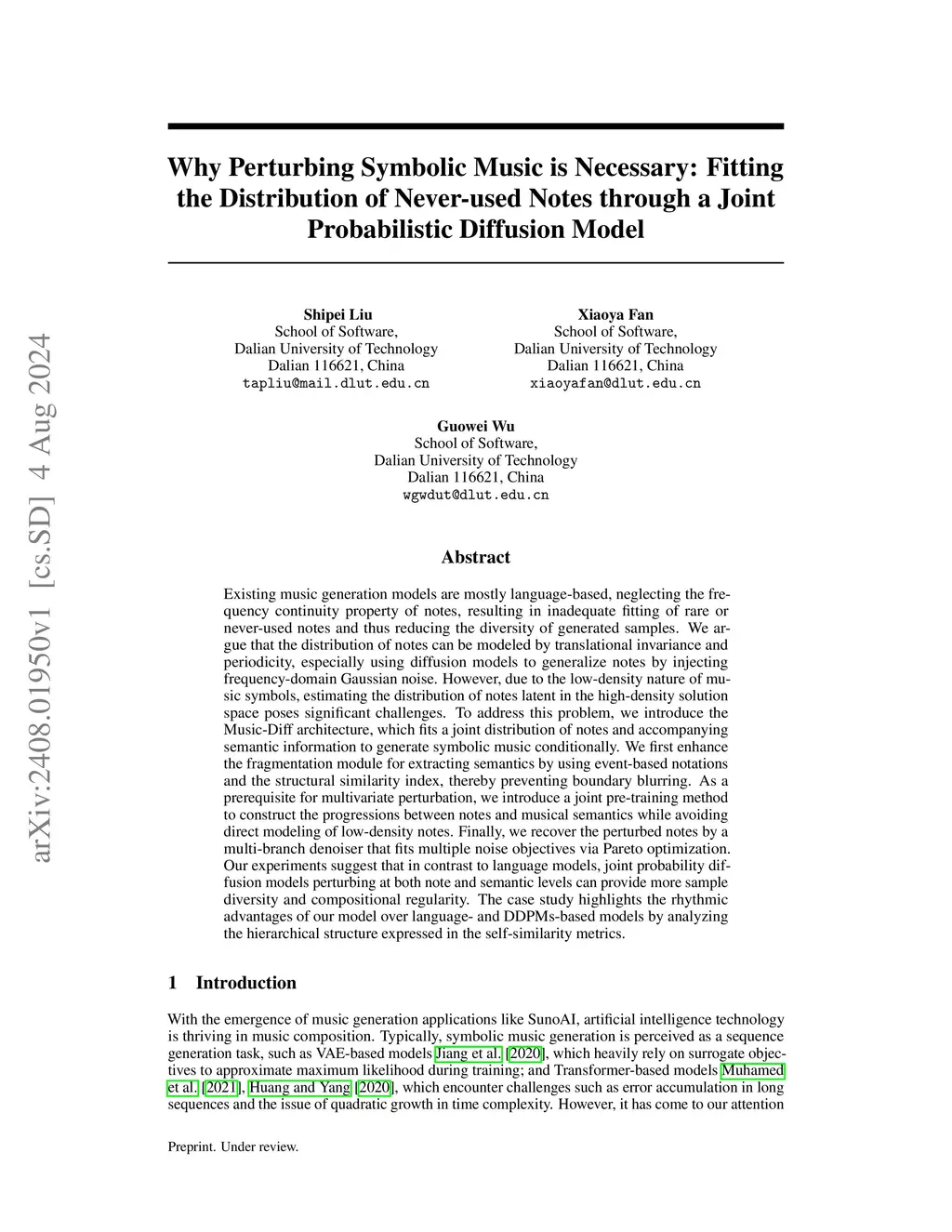 Existing music generation models are mostly language-based, neglecting the frequency continuity property of notes, resulting in inadequate fitting of rare or never-used notes and thus reducing the diversity of generated samples. We argue that the distribution of notes can be modeled by translational invariance and periodicity, especially using diffusion models to generalize notes by injecting frequency-domain Gaussian noise. However, due to the low-density nature of music symbols, estimating the distribution of notes latent in the high-density solution space poses significant challenges. To address this problem, we introduce the Music-Diff architecture, which fits a joint distribution of notes and accompanying semantic information to generate symbolic music conditionally. We first enhance the fragmentation module for extracting semantics by using event-based notations and the structural similarity index, thereby preventing boundary blurring. As a prerequisite for multivariate perturbation, we introduce a joint pre-training method to construct the progressions between notes and musical semantics while avoiding direct modeling of low-density notes. Finally, we recover the perturbed notes by a multi-branch denoiser that fits multiple noise objectives via Pareto optimization. Our experiments suggest that in contrast to language models, joint probability diffusion models perturbing at both note and semantic levels can provide more sample diversity and compositional regularity. The case study highlights the rhythmic advantages of our model over language- and DDPMs-based models by analyzing the hierarchical structure expressed in the self-similarity metrics.