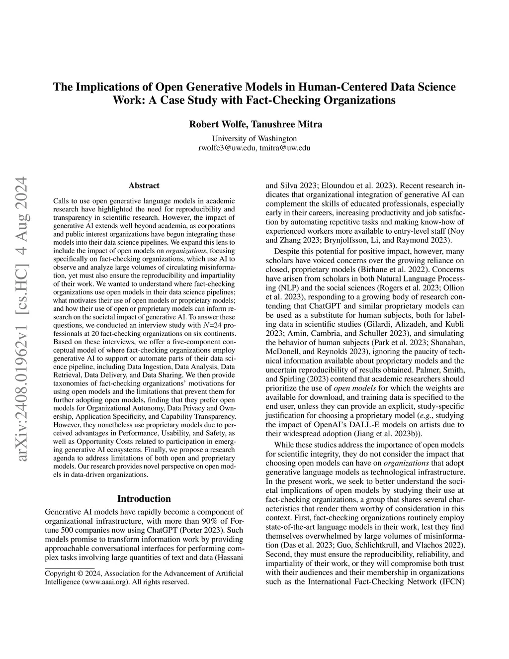 Calls to use open generative language models in academic research have highlighted the need for reproducibility and transparency in scientific research. However, the impact of generative AI extends well beyond academia, as corporations and public interest organizations have begun integrating these models into their data science pipelines. We expand this lens to include the impact of open models on organizations, focusing specifically on fact-checking organizations, which use AI to observe and analyze large volumes of circulating misinformation, yet must also ensure the reproducibility and impartiality of their work. We wanted to understand where fact-checking organizations use open models in their data science pipelines; what motivates their use of open models or proprietary models; and how their use of open or proprietary models can inform research on the societal impact of generative AI. To answer these questions, we conducted an interview study with N=24 professionals at 20 fact-checking organizations on six continents. Based on these interviews, we offer a five-component conceptual model of where fact-checking organizations employ generative AI to support or automate parts of their data science pipeline, including Data Ingestion, Data Analysis, Data Retrieval, Data Delivery, and Data Sharing. We then provide taxonomies of fact-checking organizations' motivations for using open models and the limitations that prevent them for further adopting open models, finding that they prefer open models for Organizational Autonomy, Data Privacy and Ownership, Application Specificity, and Capability Transparency. However, they nonetheless use proprietary models due to perceived advantages in Performance, Usability, and Safety, as well as Opportunity Costs related to participation in emerging generative AI ecosystems. Our work provides novel perspective on open models in data-driven organizations.