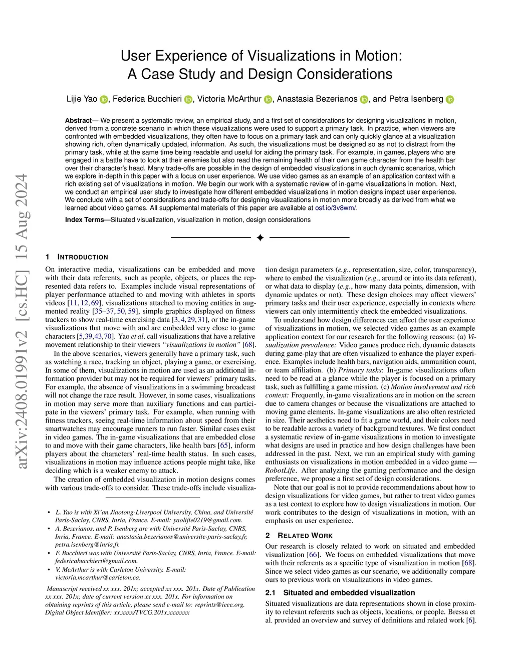 We present a systematic review, an empirical study, and a first set of considerations for designing visualizations in motion, derived from a concrete scenario in which these visualizations were used to support a primary task. In practice, when viewers are confronted with embedded visualizations, they often have to focus on a primary task and can only quickly glance at a visualization showing rich, often dynamically updated, information. As such, the visualizations must be designed so as not to distract from the primary task, while at the same time being readable and useful for aiding the primary task. For example, in games, players who are engaged in a battle have to look at their enemies but also read the remaining health of their own game character from the health bar over their character's head. Many trade-offs are possible in the design of embedded visualizations in such dynamic scenarios, which we explore in-depth in this paper with a focus on user experience. We use video games as an example of an application context with a rich existing set of visualizations in motion. We begin our work with a systematic review of in-game visualizations in motion. Next, we conduct an empirical user study to investigate how different embedded visualizations in motion designs impact user experience. We conclude with a set of considerations and trade-offs for designing visualizations in motion more broadly as derived from what we learned about video games. All supplemental materials of this paper are available at https://osf.io/3v8wm/}.