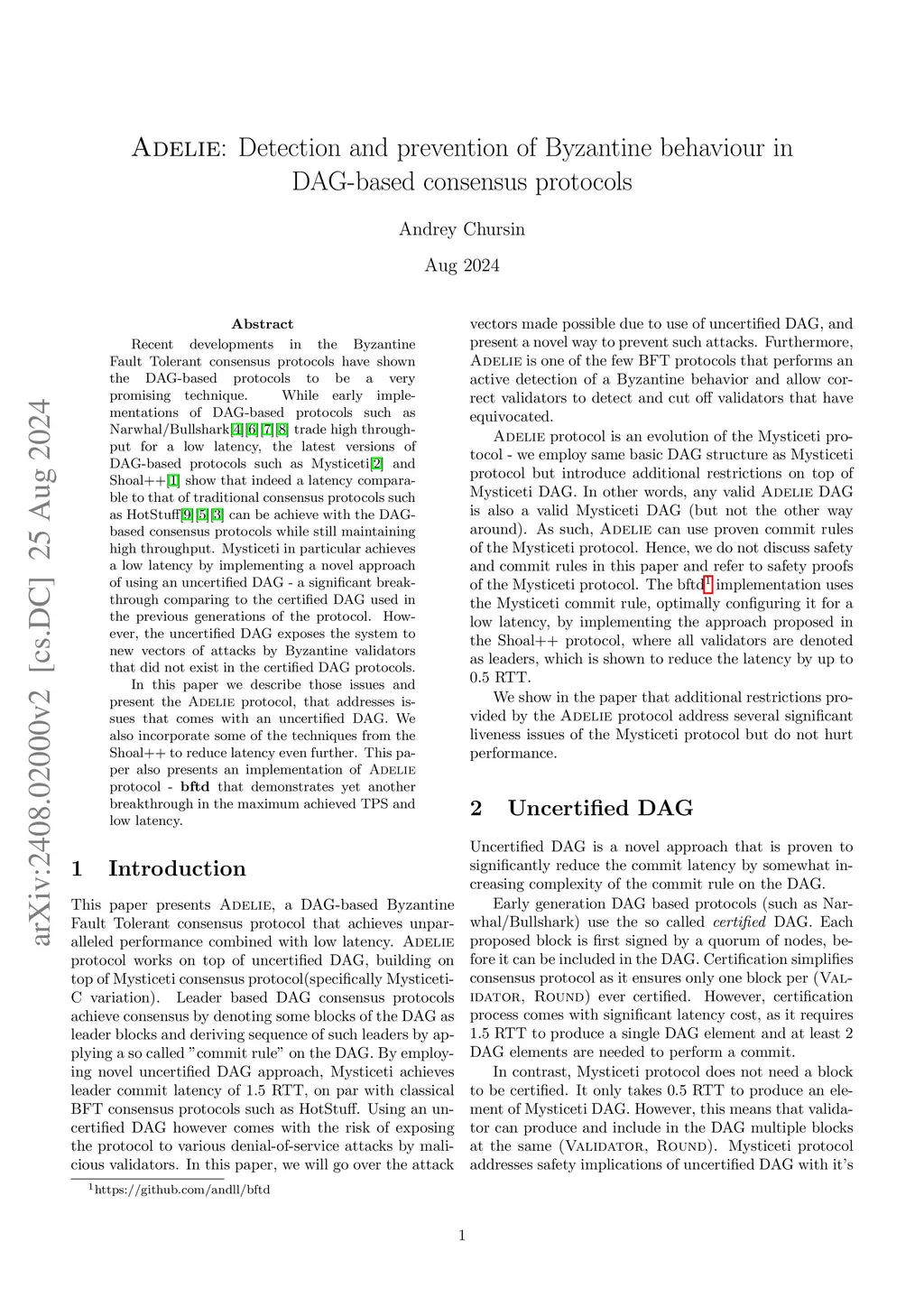 Recent developments in the Byzantine Fault Tolerant consensus protocols have shown the DAG-based protocols to be a very promising technique. While early implementations of DAG-based protocols such as Narwhal/Bullshark trade high throughput for a low latency, the latest versions of DAG-based protocols such as Mysticeti and Shoal++ show that indeed a latency comparable to that of traditional consensus protocols such as HotStuff can be achieve with the DAG-based consensus protocols while still maintaining high throughput. Mysticeti in particular achieves a low latency by implementing a novel approach of using an uncertified DAG - a significant breakthrough comparing to the certified DAG used in the previous generations of the protocol. However, the uncertified DAG exposes the system to new vectors of attacks by Byzantine validators that did not exist in the certified DAG protocols. In this paper we describe those issues and present the Adelie protocol, that addresses issues that comes with an uncertified DAG. We also incorporate some of the techniques from the Shoal++ to reduce latency even further. This paper also presents an implementation of Adelie protocol - bftd that demonstrates yet another breakthrough in the maximum achieved TPS and low latency.