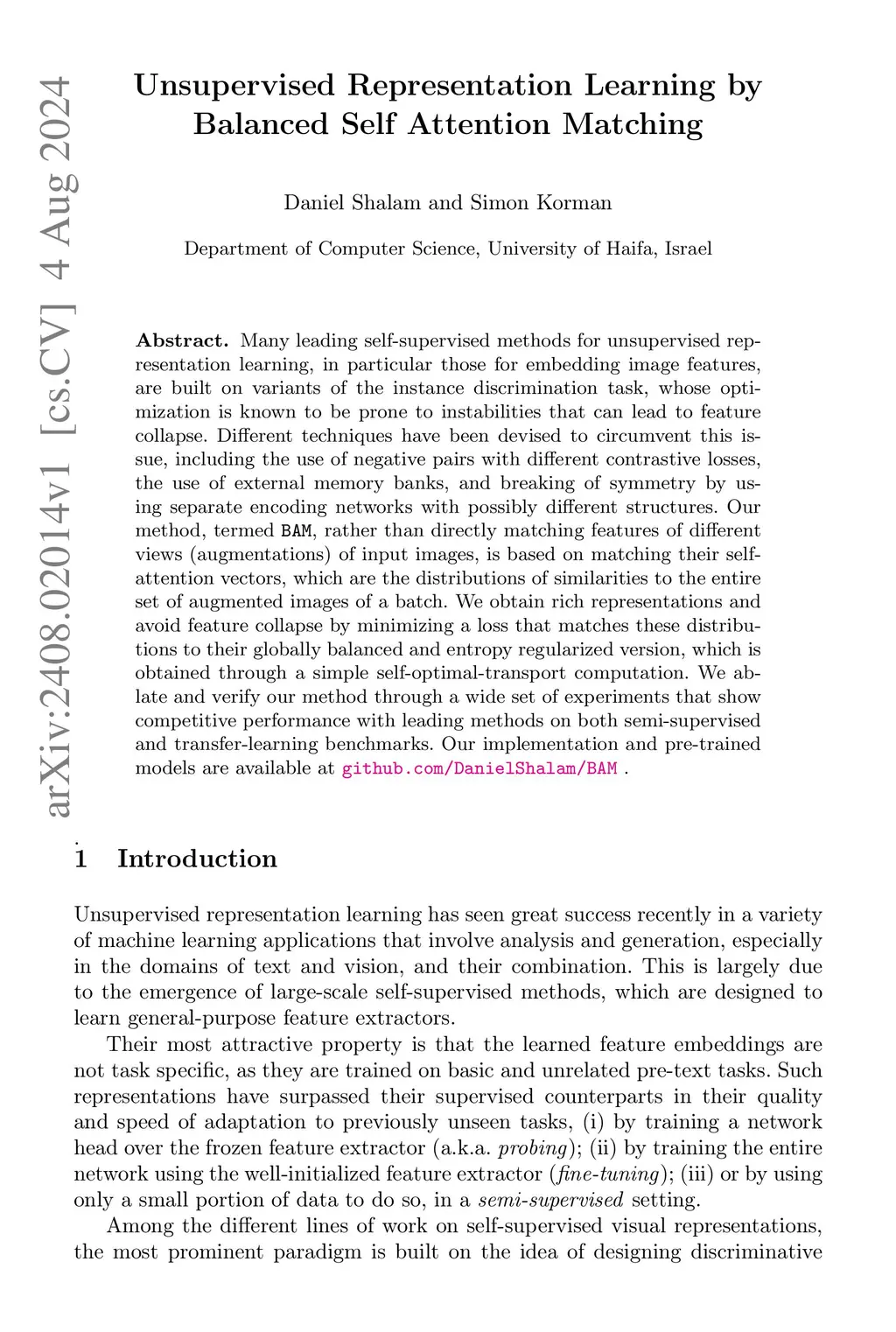 Many leading self-supervised methods for unsupervised representation learning, in particular those for embedding image features, are built on variants of the instance discrimination task, whose optimization is known to be prone to instabilities that can lead to feature collapse. Different techniques have been devised to circumvent this issue, including the use of negative pairs with different contrastive losses, the use of external memory banks, and breaking of symmetry by using separate encoding networks with possibly different structures. Our method, termed BAM, rather than directly matching features of different views (augmentations) of input images, is based on matching their self-attention vectors, which are the distributions of similarities to the entire set of augmented images of a batch. We obtain rich representations and avoid feature collapse by minimizing a loss that matches these distributions to their globally balanced and entropy regularized version, which is obtained through a simple self-optimal-transport computation. We ablate and verify our method through a wide set of experiments that show competitive performance with leading methods on both semi-supervised and transfer-learning benchmarks. Our implementation and pre-trained models are available at github.com/DanielShalam/BAM .