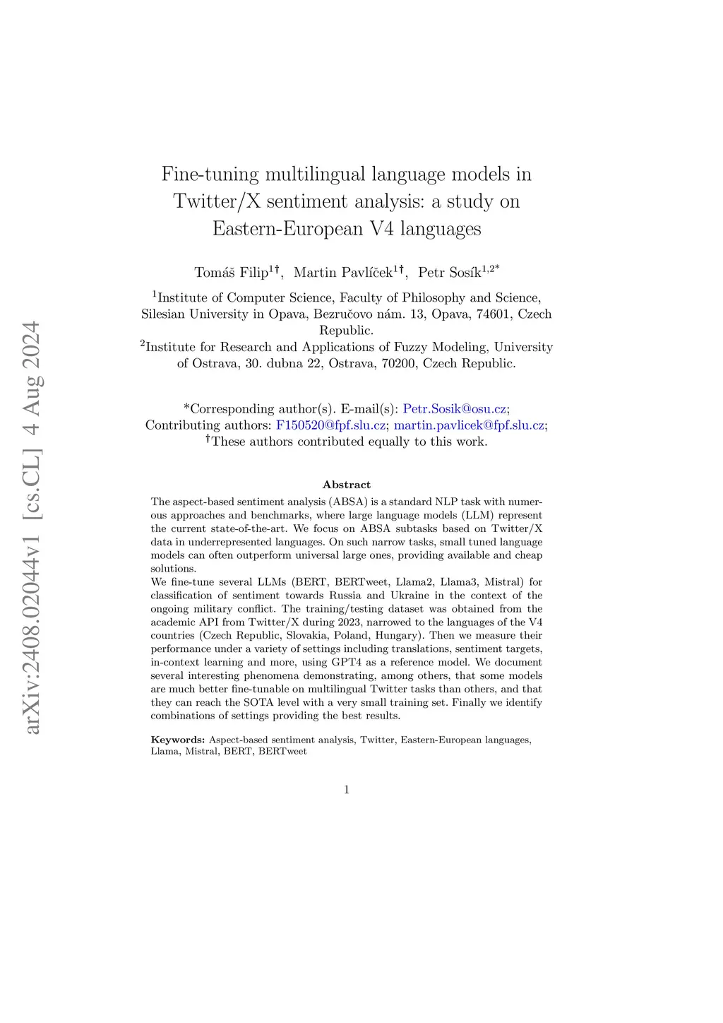 The aspect-based sentiment analysis (ABSA) is a standard NLP task with numerous approaches and benchmarks, where large language models (LLM) represent the current state-of-the-art. We focus on ABSA subtasks based on Twitter/X data in underrepresented languages. On such narrow tasks, small tuned language models can often outperform universal large ones, providing available and cheap solutions. We fine-tune several LLMs (BERT, BERTweet, Llama2, Llama3, Mistral) for classification of sentiment towards Russia and Ukraine in the context of the ongoing military conflict. The training/testing dataset was obtained from the academic API from Twitter/X during 2023, narrowed to the languages of the V4 countries (Czech Republic, Slovakia, Poland, Hungary). Then we measure their performance under a variety of settings including translations, sentiment targets, in-context learning and more, using GPT4 as a reference model. We document several interesting phenomena demonstrating, among others, that some models are much better fine-tunable on multilingual Twitter tasks than others, and that they can reach the SOTA level with a very small training set. Finally we identify combinations of settings providing the best results.