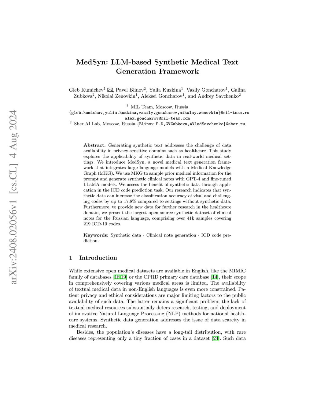 Generating synthetic text addresses the challenge of data availability in privacy-sensitive domains such as healthcare. This study explores the applicability of synthetic data in real-world medical settings. We introduce MedSyn, a novel medical text generation framework that integrates large language models with a Medical Knowledge Graph (MKG). We use MKG to sample prior medical information for the prompt and generate synthetic clinical notes with GPT-4 and fine-tuned LLaMA models. We assess the benefit of synthetic data through application in the ICD code prediction task. Our research indicates that synthetic data can increase the classification accuracy of vital and challenging codes by up to 17.8% compared to settings without synthetic data. Furthermore, to provide new data for further research in the healthcare domain, we present the largest open-source synthetic dataset of clinical notes for the Russian language, comprising over 41k samples covering 219 ICD-10 codes.