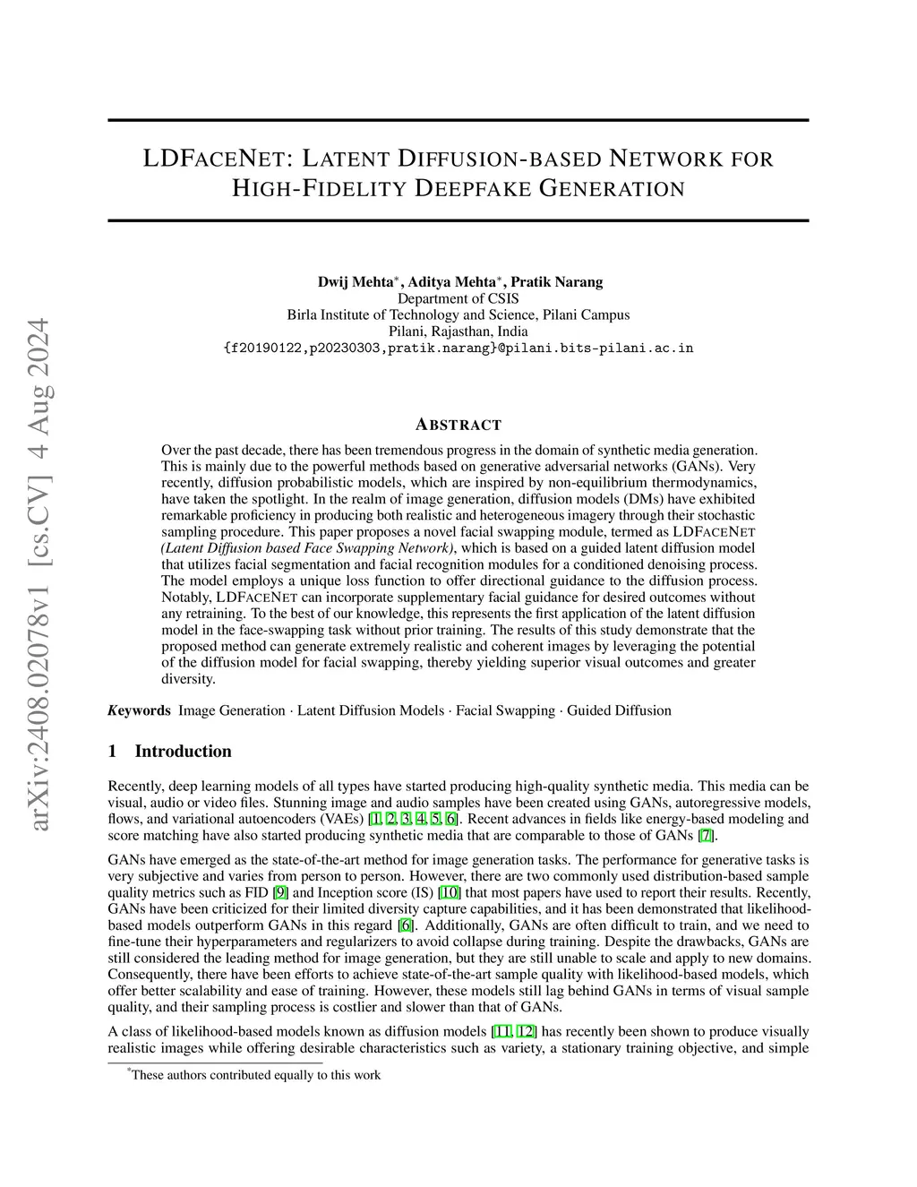 LDFaceNet: Latent Diffusion-based Network for High-Fidelity Deepfake