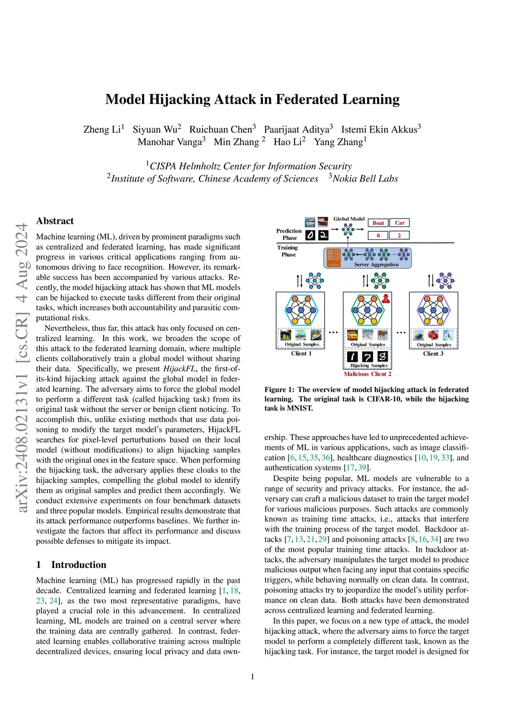 Machine learning (ML), driven by prominent paradigms such as centralized and federated learning, has made significant progress in various critical applications ranging from autonomous driving to face recognition. However, its remarkable success has been accompanied by various attacks. Recently, the model hijacking attack has shown that ML models can be hijacked to execute tasks different from their original tasks, which increases both accountability and parasitic computational risks. Nevertheless, thus far, this attack has only focused on centralized learning. In this work, we broaden the scope of this attack to the federated learning domain, where multiple clients collaboratively train a global model without sharing their data. Specifically, we present HijackFL, the first-of-its-kind hijacking attack against the global model in federated learning. The adversary aims to force the global model to perform a different task (called hijacking task) from its original task without the server or benign client noticing. To accomplish this, unlike existing methods that use data poisoning to modify the target model's parameters, HijackFL searches for pixel-level perturbations based on their local model (without modifications) to align hijacking samples with the original ones in the feature space. When performing the hijacking task, the adversary applies these cloaks to the hijacking samples, compelling the global model to identify them as original samples and predict them accordingly. We conduct extensive experiments on four benchmark datasets and three popular models. Empirical results demonstrate that its attack performance outperforms baselines. We further investigate the factors that affect its performance and discuss possible defenses to mitigate its impact.