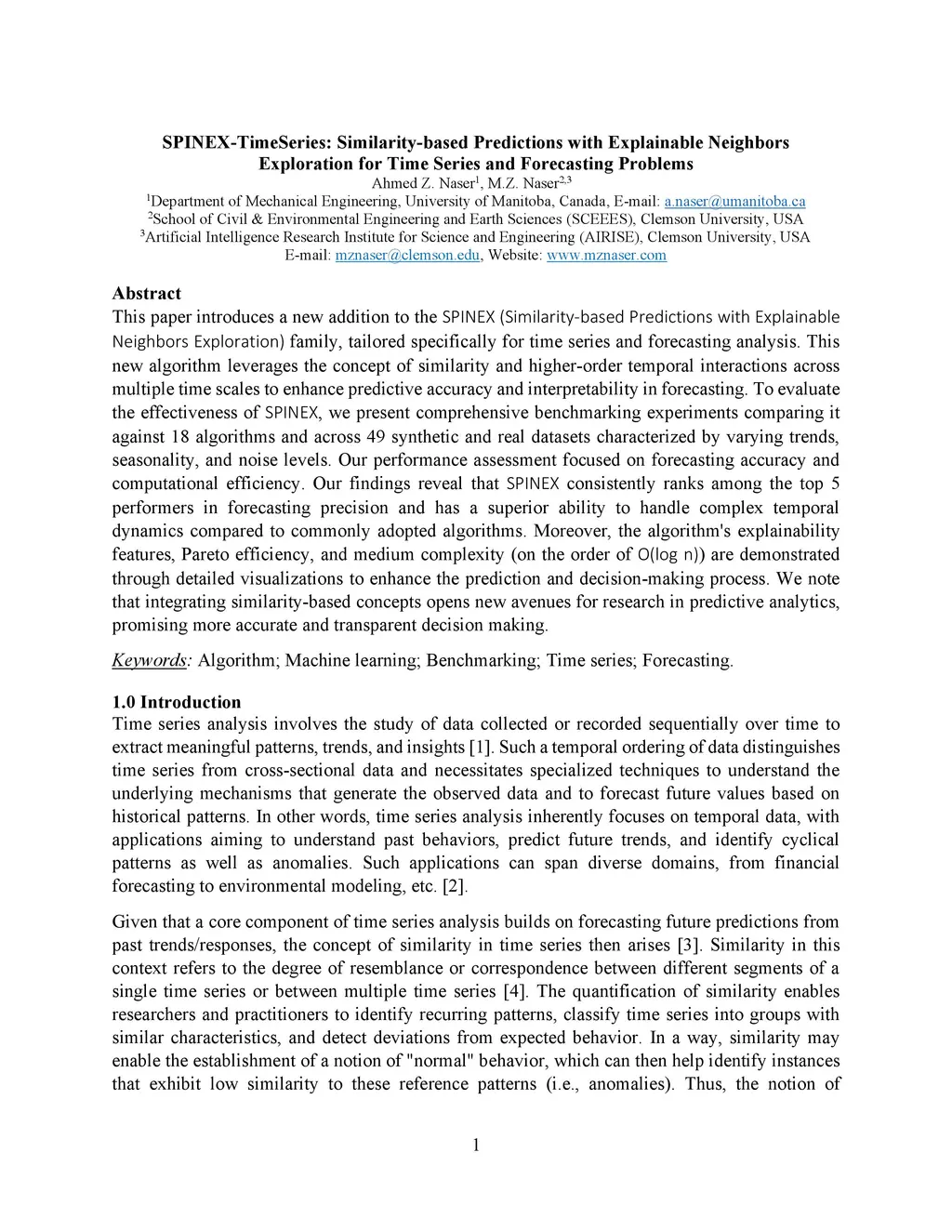 This paper introduces a new addition to the SPINEX (Similarity-based Predictions with Explainable Neighbors Exploration) family, tailored specifically for time series and forecasting analysis. This new algorithm leverages the concept of similarity and higher-order temporal interactions across multiple time scales to enhance predictive accuracy and interpretability in forecasting. To evaluate the effectiveness of SPINEX, we present comprehensive benchmarking experiments comparing it against 18 algorithms and across 49 synthetic and real datasets characterized by varying trends, seasonality, and noise levels. Our performance assessment focused on forecasting accuracy and computational efficiency. Our findings reveal that SPINEX consistently ranks among the top 5 performers in forecasting precision and has a superior ability to handle complex temporal dynamics compared to commonly adopted algorithms. Moreover, the algorithm's explainability features, Pareto efficiency, and medium complexity (on the order of O(log n)) are demonstrated through detailed visualizations to enhance the prediction and decision-making process. We note that integrating similarity-based concepts opens new avenues for research in predictive analytics, promising more accurate and transparent decision making.