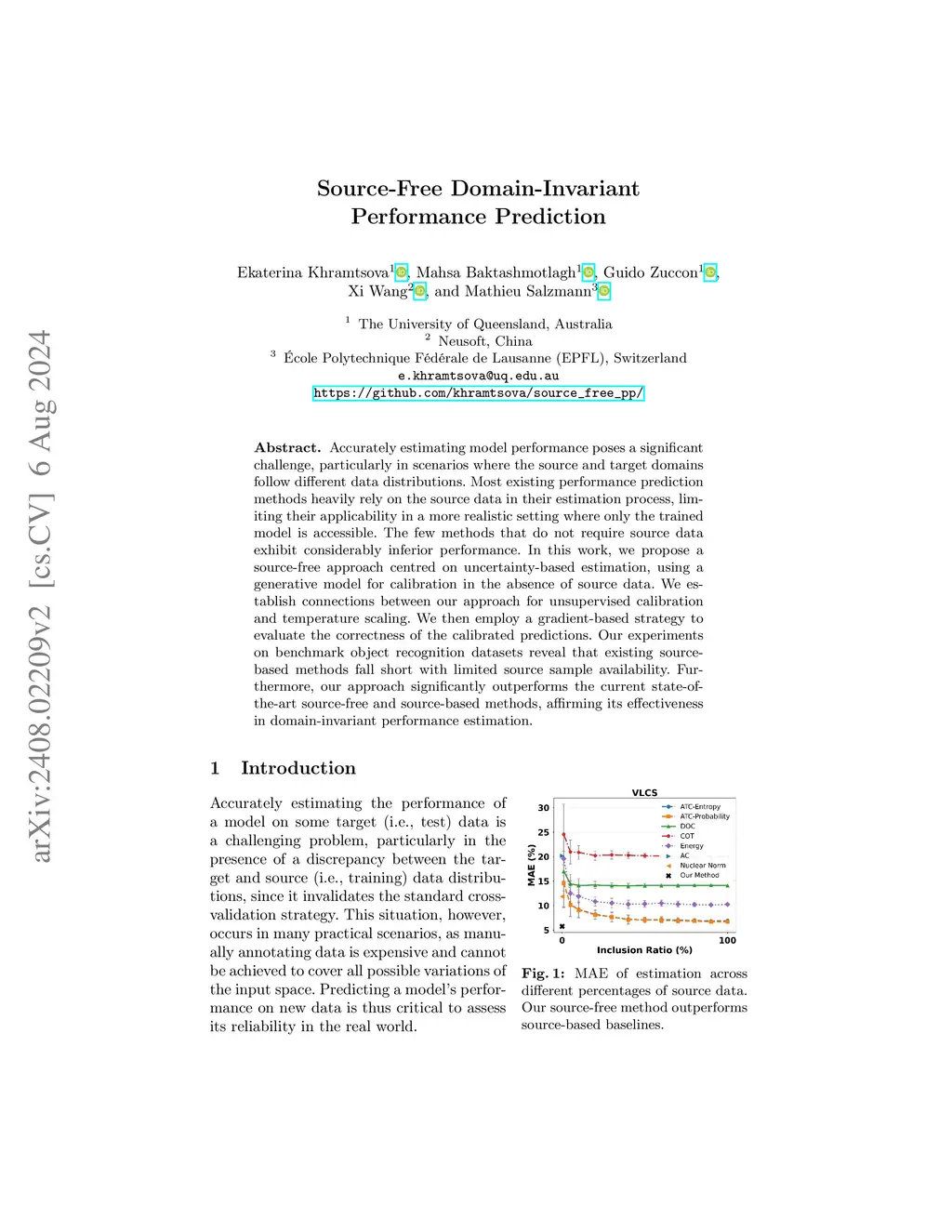 Accurately estimating model performance poses a significant challenge, particularly in scenarios where the source and target domains follow different data distributions. Most existing performance prediction methods heavily rely on the source data in their estimation process, limiting their applicability in a more realistic setting where only the trained model is accessible. The few methods that do not require source data exhibit considerably inferior performance. In this work, we propose a source-free approach centred on uncertainty-based estimation, using a generative model for calibration in the absence of source data. We establish connections between our approach for unsupervised calibration and temperature scaling. We then employ a gradient-based strategy to evaluate the correctness of the calibrated predictions. Our experiments on benchmark object recognition datasets reveal that existing source-based methods fall short with limited source sample availability. Furthermore, our approach significantly outperforms the current state-of-the-art source-free and source-based methods, affirming its effectiveness in domain-invariant performance estimation.