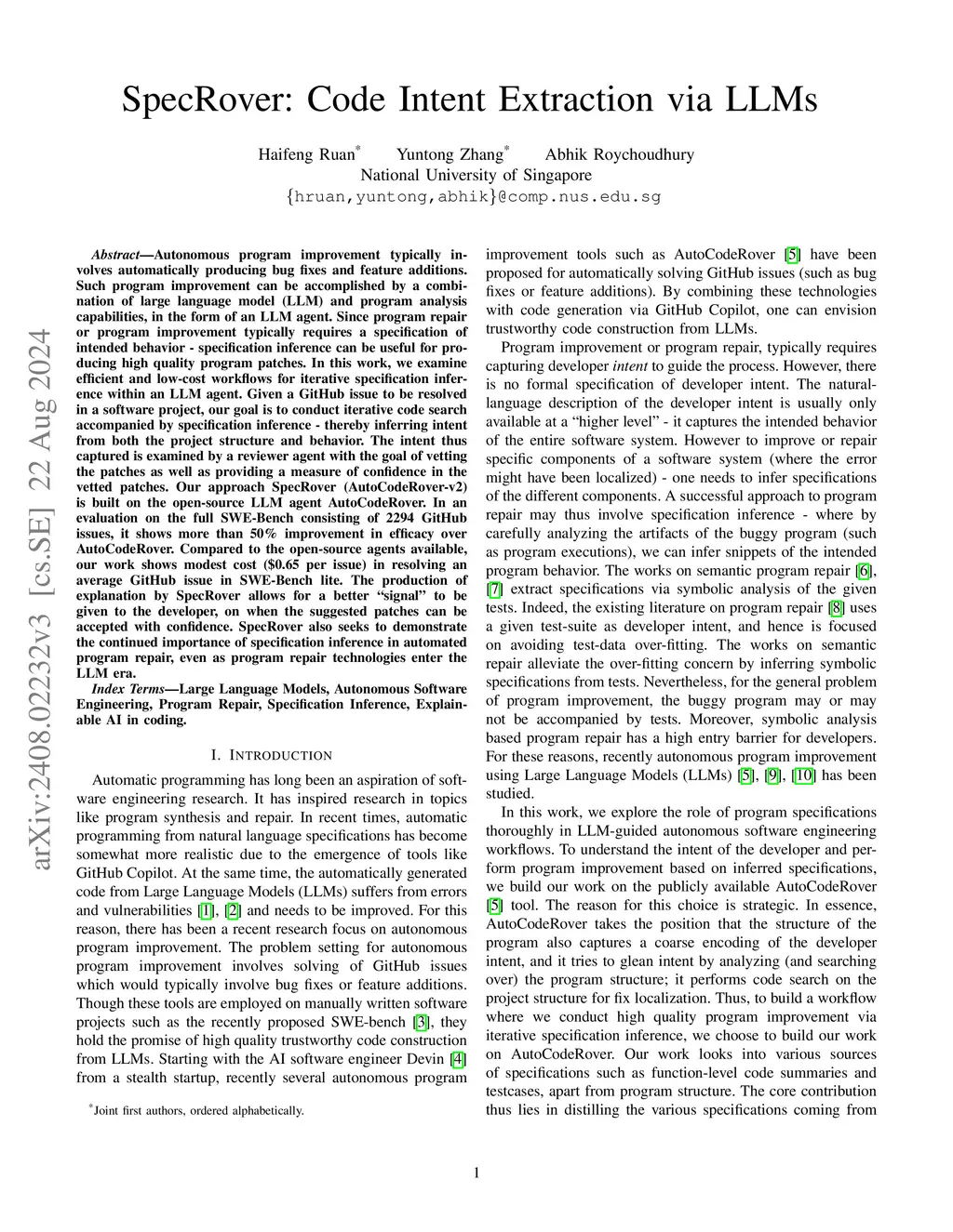 SpecRover: Code Intent Extraction via LLMs