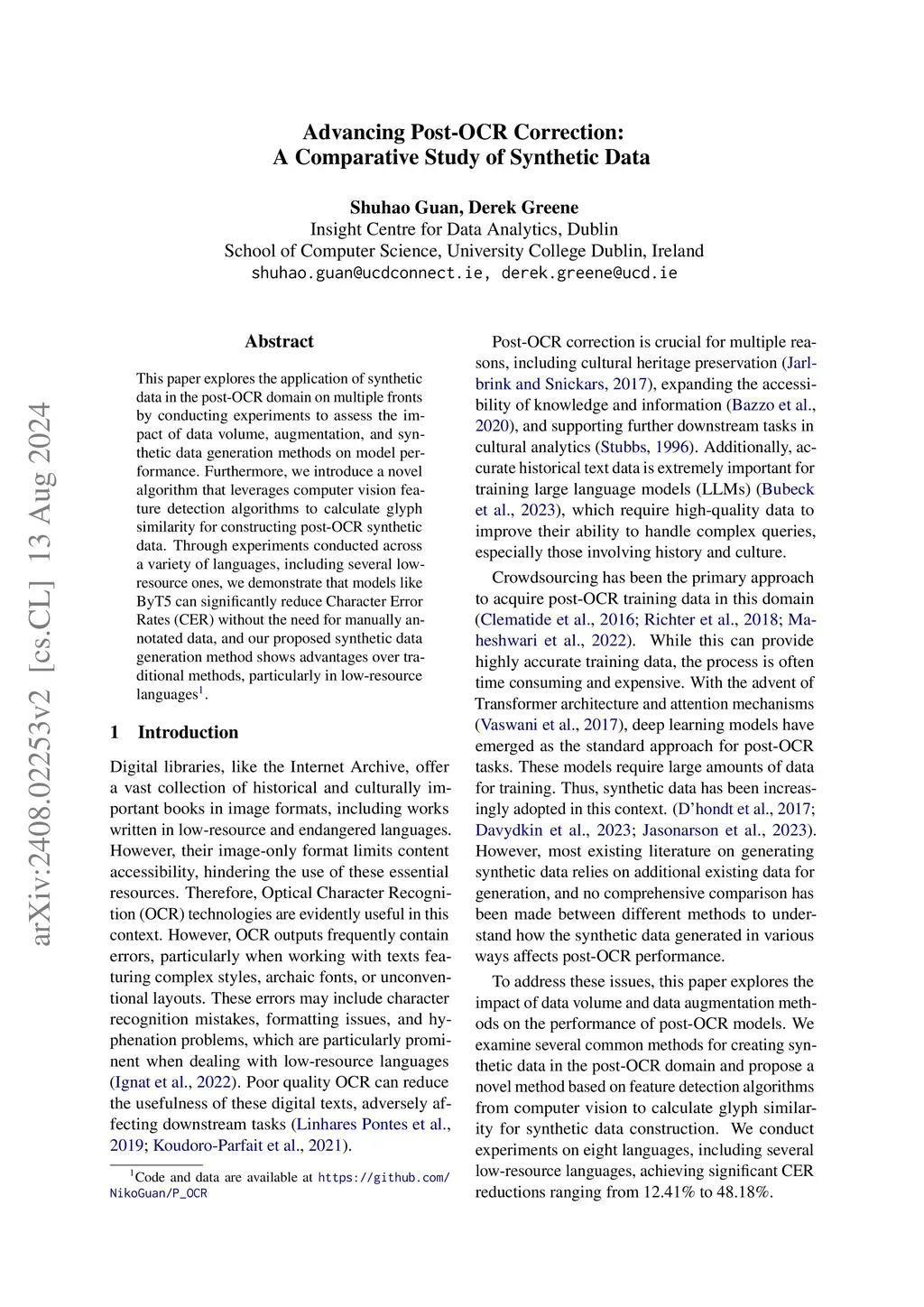 This paper explores the application of synthetic data in the post-OCR domain on multiple fronts by conducting experiments to assess the impact of data volume, augmentation, and synthetic data generation methods on model performance. Furthermore, we introduce a novel algorithm that leverages computer vision feature detection algorithms to calculate glyph similarity for constructing post-OCR synthetic data. Through experiments conducted across a variety of languages, including several low-resource ones, we demonstrate that models like ByT5 can significantly reduce Character Error Rates (CER) without the need for manually annotated data, and our proposed synthetic data generation method shows advantages over traditional methods, particularly in low-resource languages.