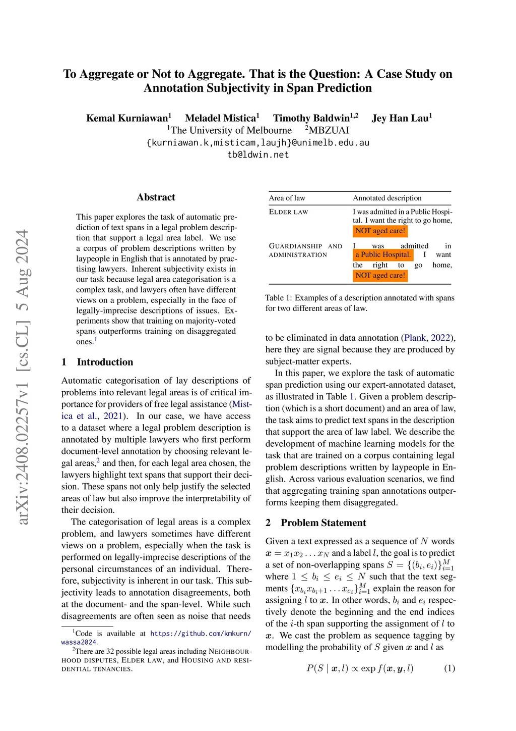This paper explores the task of automatic prediction of text spans in a legal problem description that support a legal area label. We use a corpus of problem descriptions written by laypeople in English that is annotated by practising lawyers. Inherent subjectivity exists in our task because legal area categorisation is a complex task, and lawyers often have different views on a problem, especially in the face of legally-imprecise descriptions of issues. Experiments show that training on majority-voted spans outperforms training on disaggregated ones.